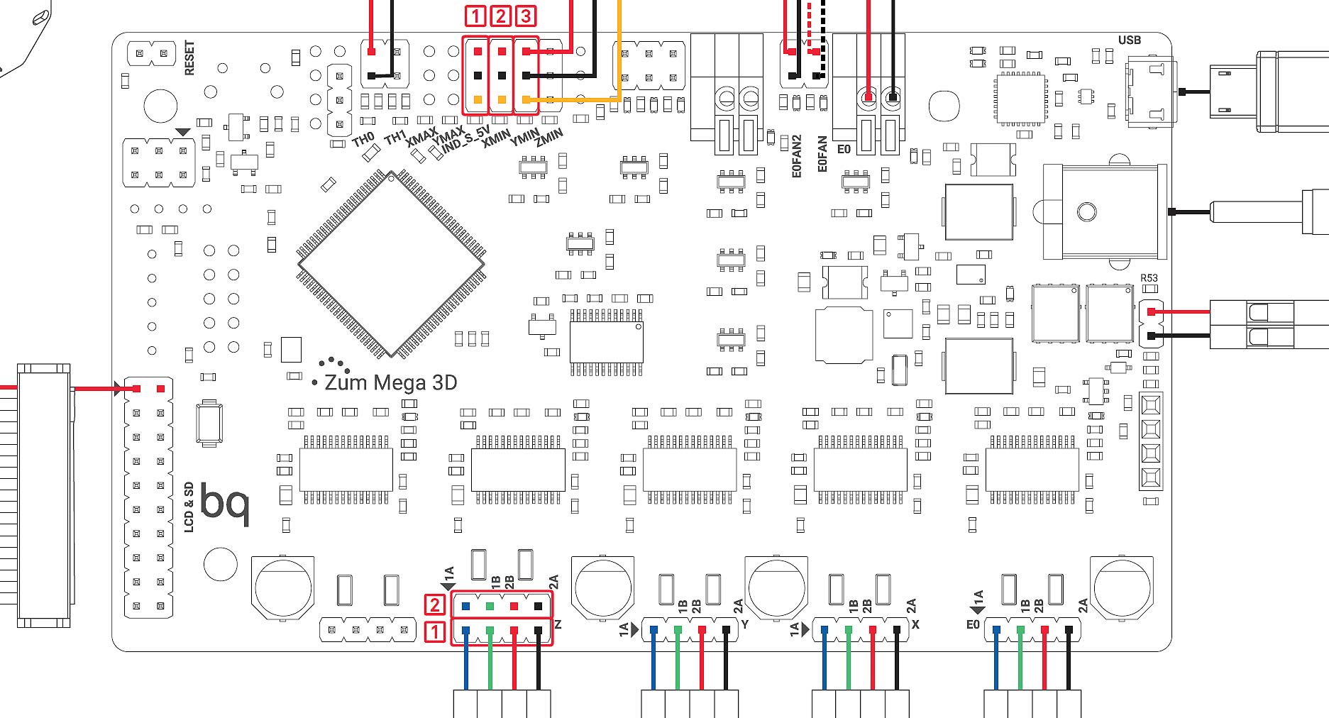 La led entourée en bleu, allumée correspond à un problème au niveau du moteur de l'extrudeur