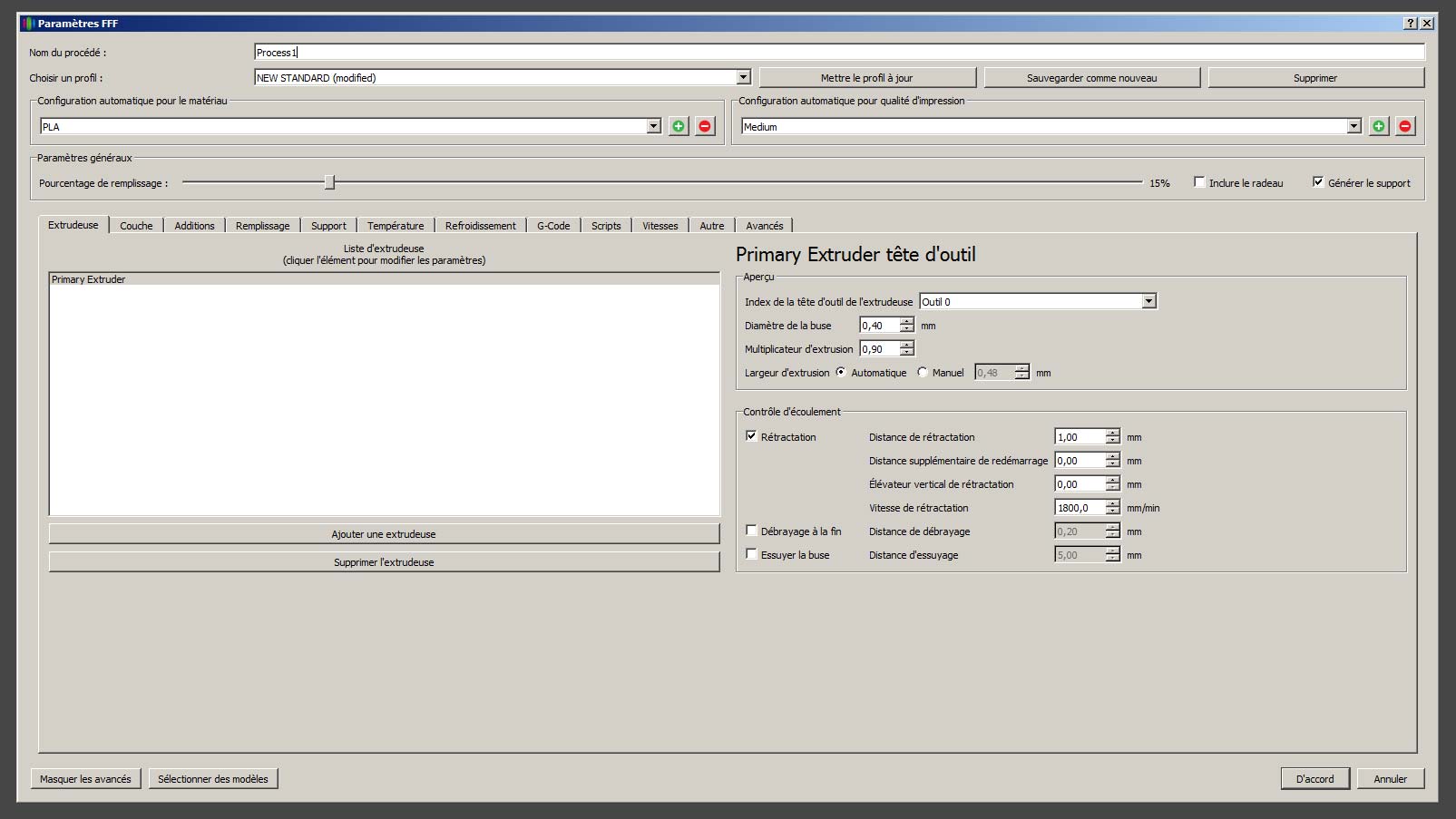 Par contre je ne sais pas ou se trouve la taille de la buse mais j'imagine que c'est dans la configuration de l'imprimante et non dans les paramètres comme Cura par exemple