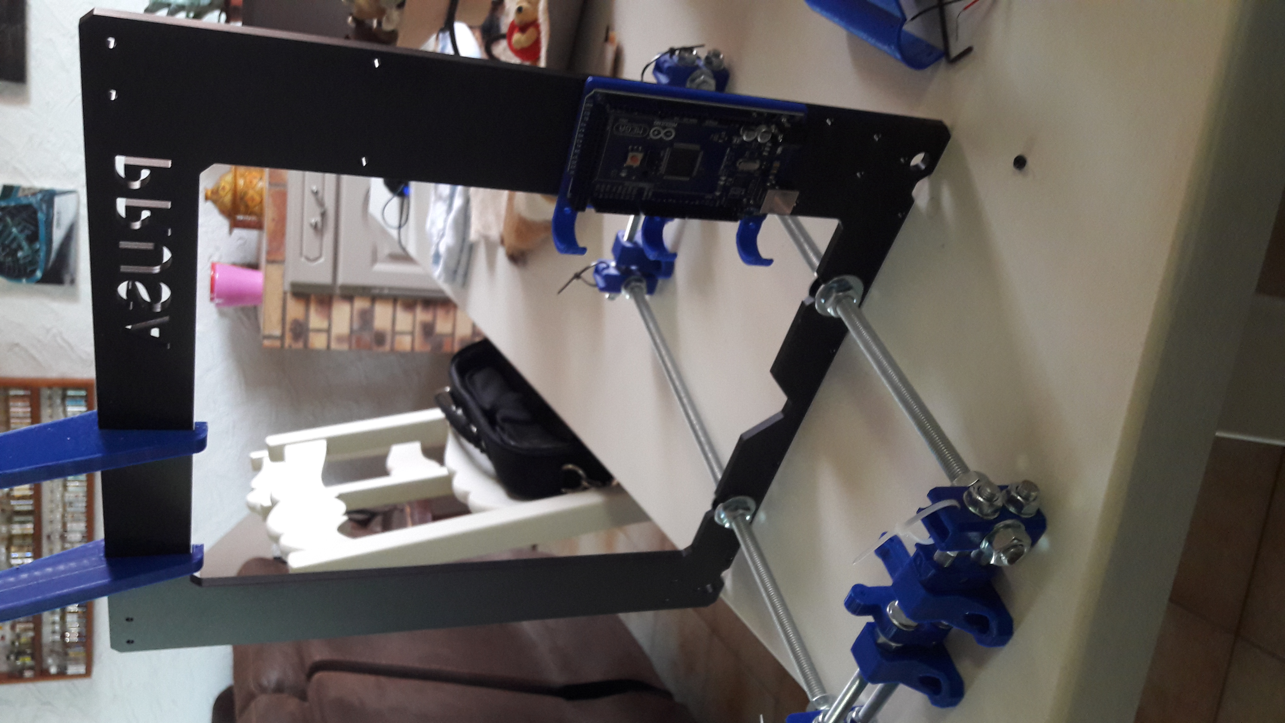 apres réception de mes piéces j'ai refait des photos alors la on a le plateau en alu de 200 x300 et ses roulements linéaire encager dans des support en alu qui 'aura couter a peu pres une 30 aines d'euros et le cadre basique en acier d'une prusa pour une 40 aine d'euros mais au moin on part sur une base solide la solution du contreplaqué ou du plexiglass en guise de cadre me plaisant moyennement j'ai donc opter pour l'acier au passage j'ai installé sur son support la carte arduino mega 2560 qu'on peut voir sur la photo d'avant , prochaine étape instaltion du plateau et des tiges D8 lisse je posterai les photos un peu plus tard =)