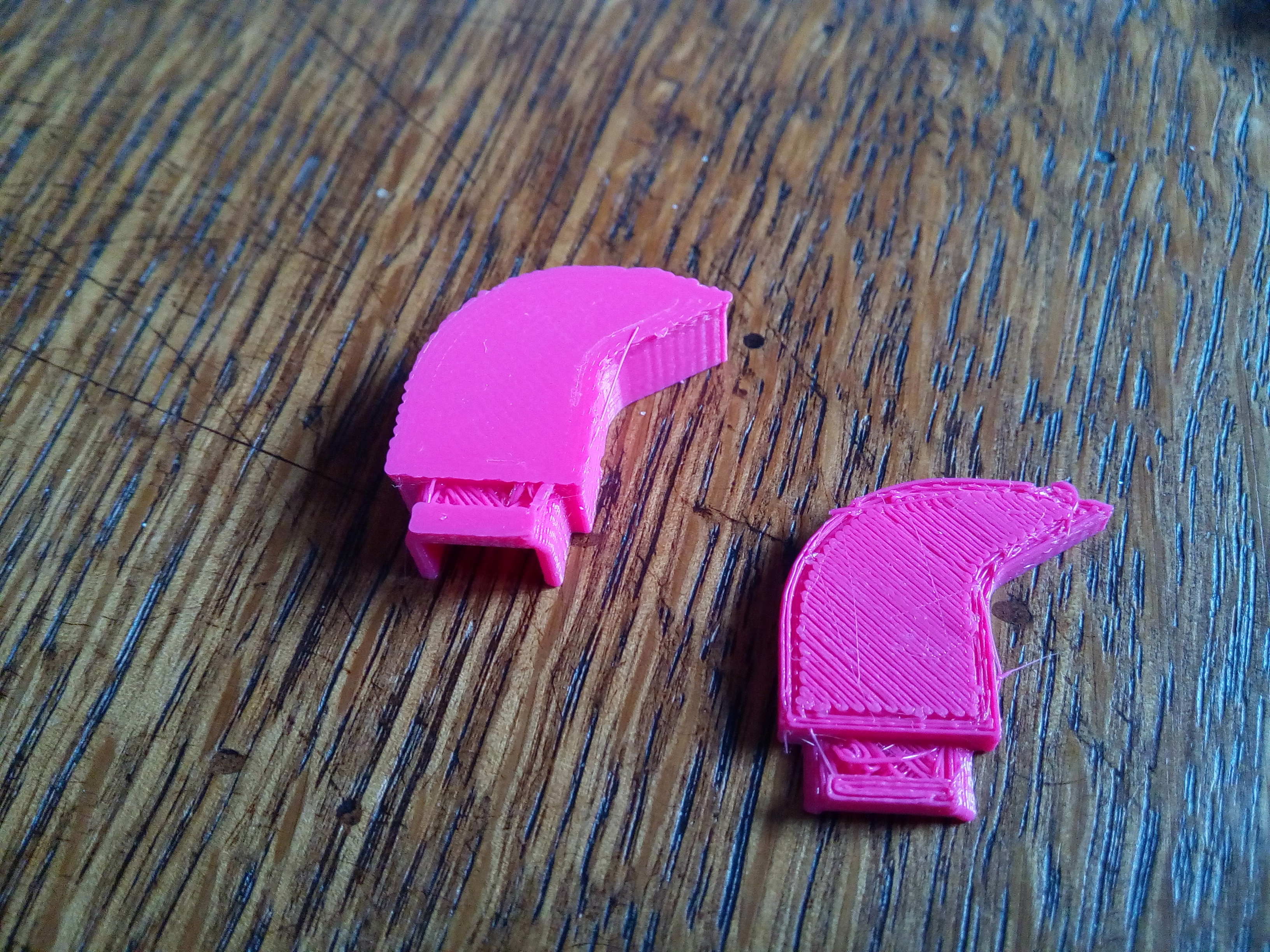 Quoi qu'il en soit, les impressions de l'après-midi ont été pénibles encore : d'abord un offset bien trop faible (la tête frottait et rien ne sortait), en réglant j'ai été amené à retirer quelque chose comme 0.3, après c'était bien trop haut, après plusieurs essais/erreurs j'ai rajouté bien plus que les 0.3 retirés initialement et j'ai fini par laisser partir avec un offset visiblement encore trop grand : quand on commence à parier sur le fait que ça va se décoller un peu mais que les pièces seront utilisables c'est qu'on a l'habitude de naviguer en eaux troubles :)