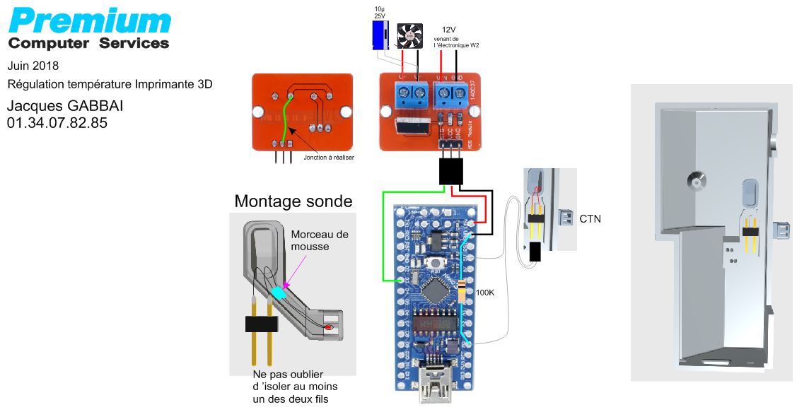 La chauffe se fait par une cartouche de 40W dans la boite et la mesure de température plus la courbe de ventilation est directement issue de la carte Arduino de régulation via le câble USB connecté.