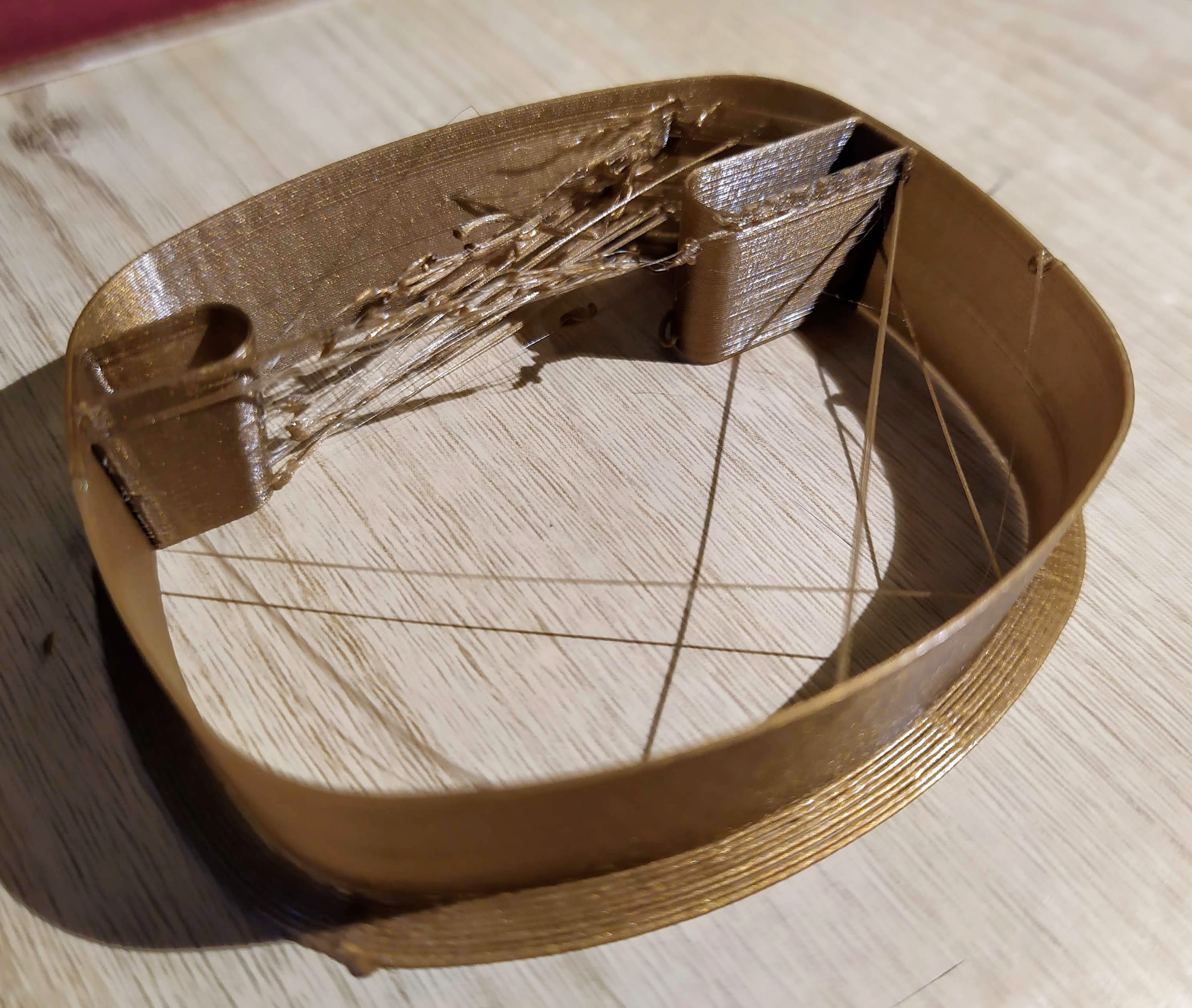 J'ai imprimé la même section test en supprimant la rétractation: le résultat étant meilleur j'ai imprimé une pièce entière : celle à gauche sur la photo. On voit encore des traces d'amincissement mais nettement moins importantes que sur celle de droite. L'état de surface extérieur est meilleur. On voit également plus de fils intérieurs réguliers non gênants.