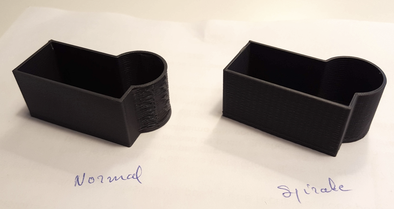 Au final, il peut être véritablement intéressant d'utiliser le mode spirale qui permet outre d'imprimer de fines parois, la possibilité de produire plus vite des volumes simples comme des casiers ou petites boites. La condition c'est de n'avoir que deux épaisseur de parois, la base et les murs. Si je prends l'exemple de petits casiers à installer dans un tiroir, on peut alors les imprimer très vite en mettant 0,4mm en dessous et 1mm en mur. Double avantage, une base fine colle bien au plateau, on peut alors réaliser vite et bien de gros casiers à disposer dans un tiroir existant.