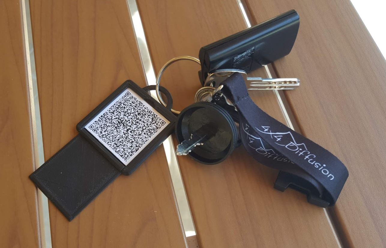 Le porte clés est une plaque avec un volet qui protège le QR code imprimé. De l'autre face un évidement permet de voir le nom.