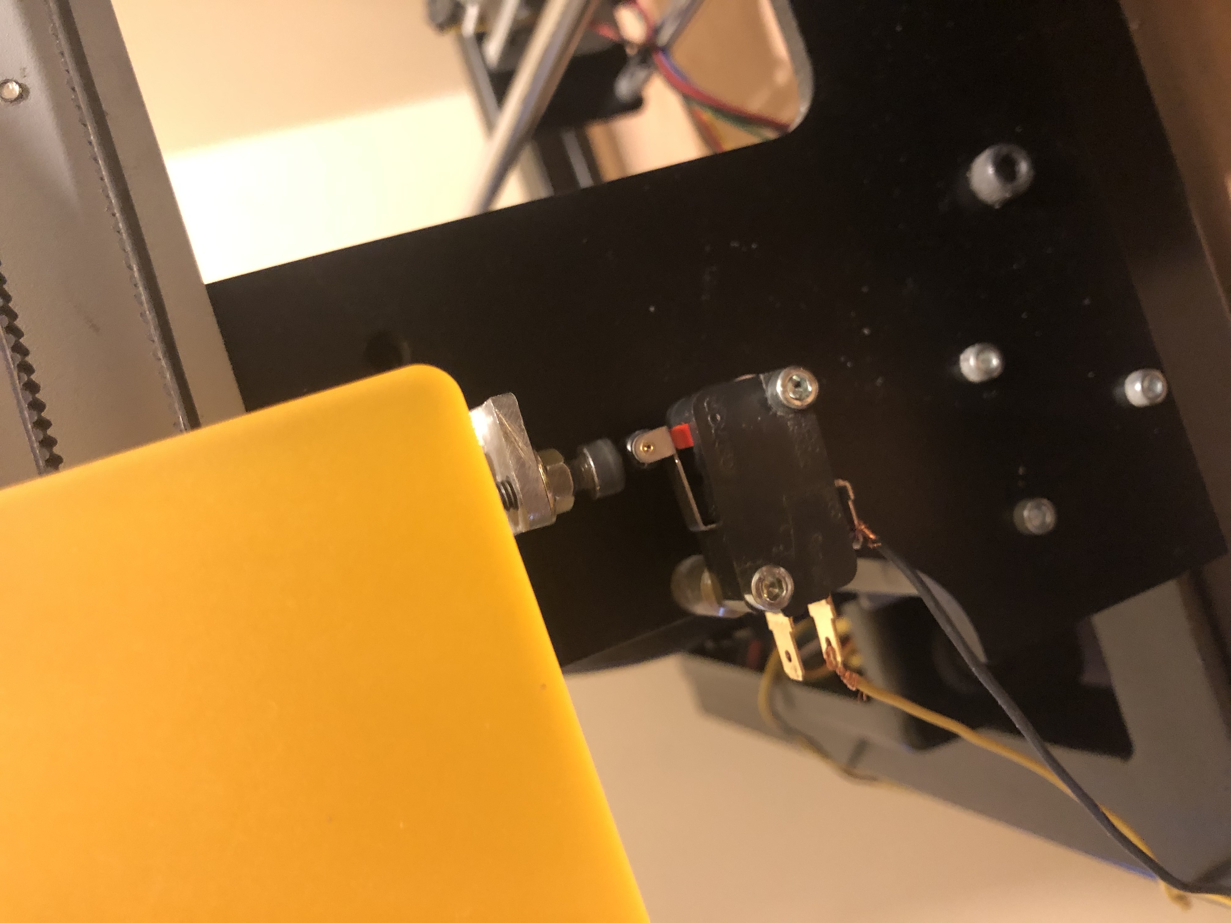 Votre micro switch fonctionne mais son type ne permettra pas d'avoir une position 0 très précise. Il vaut mieux utiliser ceux pour le X/Y peu importe la marque, ils sont plus précis car la mécanique est plus petite. Par ailleurs la vis de réglage ne devrait pas avoir de contre écrou mais un ressort afin de pouvoir la régler simplement ambiance chaude ou froide car il y a une différence minime de 0.