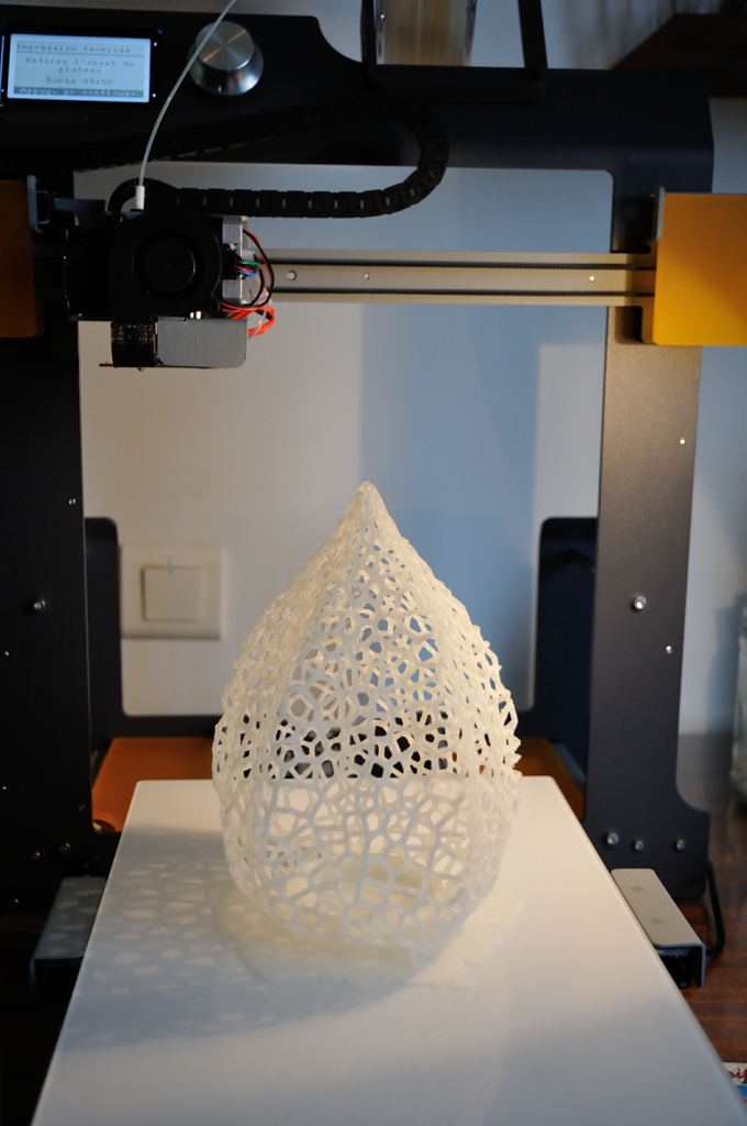 Cette première impression sans aucun support était bien de loin mais loin d’être bien. j'ai repris les choses en lissant mes cellules Voronoi pour l’esthétique, agrandi le modèle de 170 mm à 200mm et une température de 200° à 205°. Le plus important était de mettre des supports en bas pour limiter les vibrations du modèle ce qui apporte plus de précision. La première impression était de 9h la seconde de 13h.Ci joint les photos de détail.