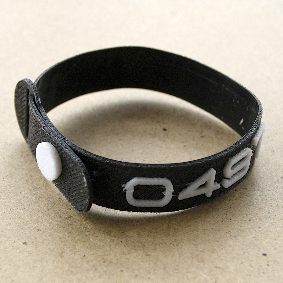 Bracelet imprimé en Ninjaflex-Semiflex dans deux couleurs distinctes et contrastées pour bien faire ressortir le texte inclus dans le dessin.