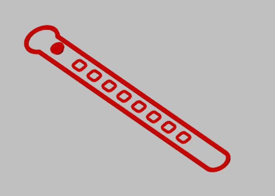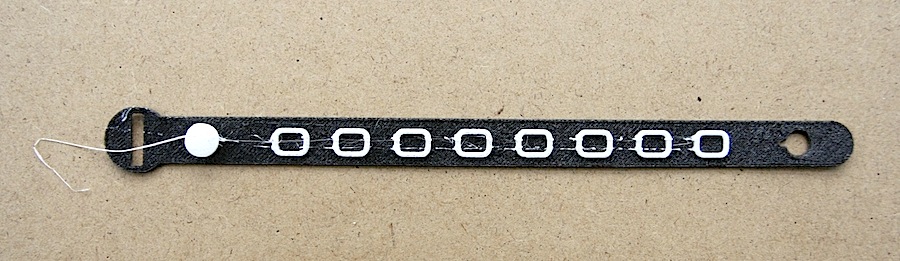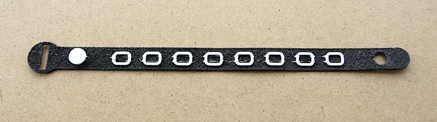 Essai 2 : bracelet avec texte en relief imprimé dans une seule couleur : ce n'est pas très lisible. Le bracelet doit rester étroit (ici 12mm de large) et le texte aussi précis que possible. Le lettrage fait ici 7mm : après essais divers, c'est le minimum pour pouvoir le lire facilement.