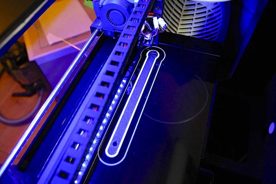Car a son lancement, il ne peut y avoir de skirt pour régulariser le flux de matière, sauf à paramétrer celui-ci très loin du texte et du leurre pour que l'imprimante évite de toucher le bracelet déjà en place sur le verre.