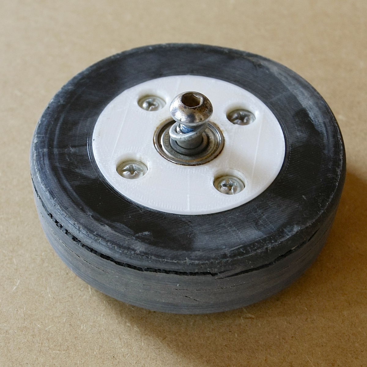 Fabrication d'une nouvelle roue pour remplacer celle qui était inutilisable sur cette trottinette achetée récemment quelques € dans une brocante.