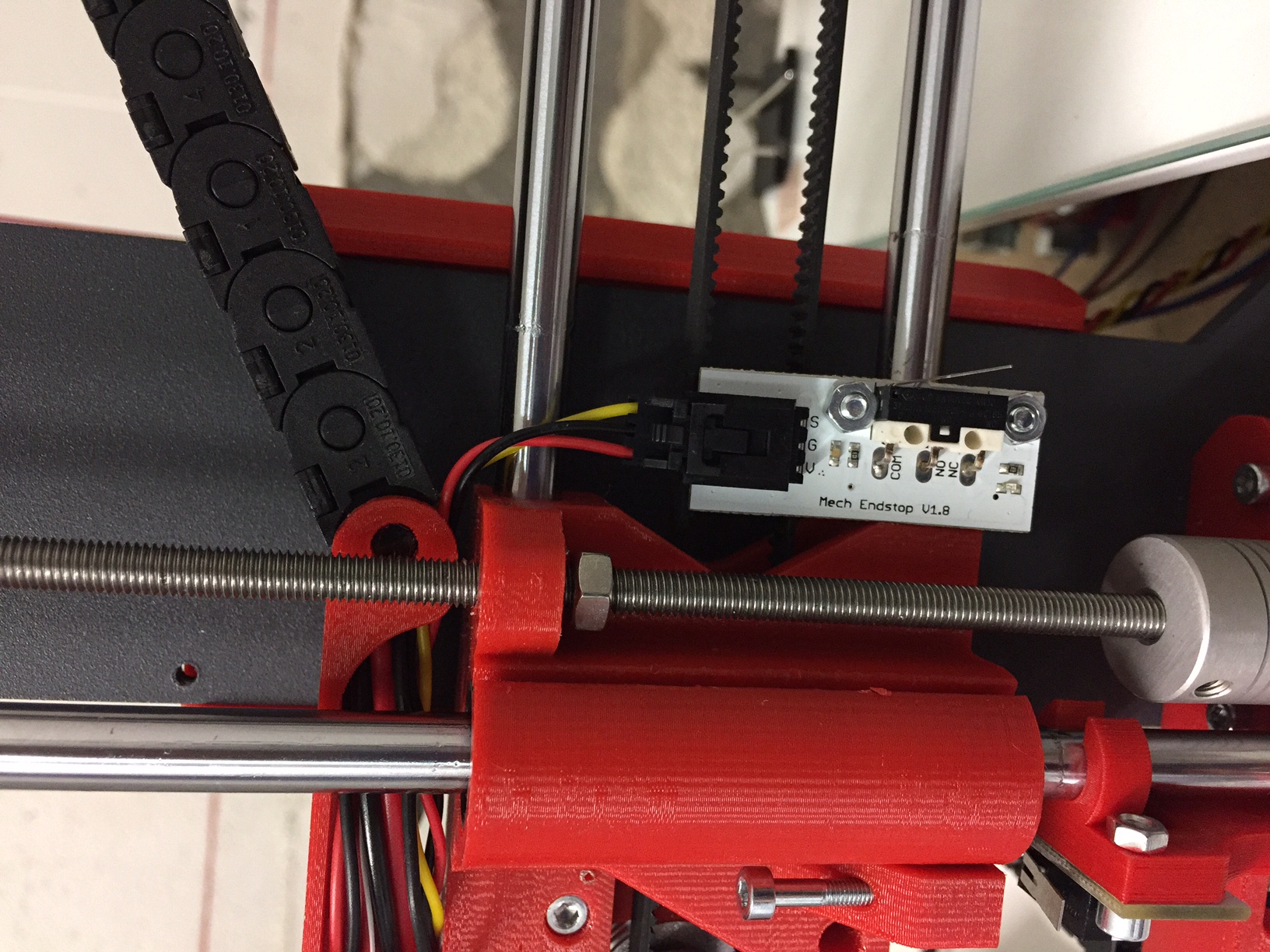 Votre imprimante allumée, poussez la tête à gauche à la main, la led doit s'allumer. Poussez le plateau en arrière, la led dessous doit s'allumer lorsqu'il est complètement en buté arrière (reglez au besoin la vis). Pour le Z appuyez à la main sur la lamelle du switch, il doit s'allumer. Vérifiez aussi que la vis est juste au-dessus et bien en face du switch. Sur la photo ci-dessous on voit le switch Z et la vis au-dessus pour le réglage Ces interrupteurs servent à définir le 0 des 3 axes qui constitueront les références lors des impressions.