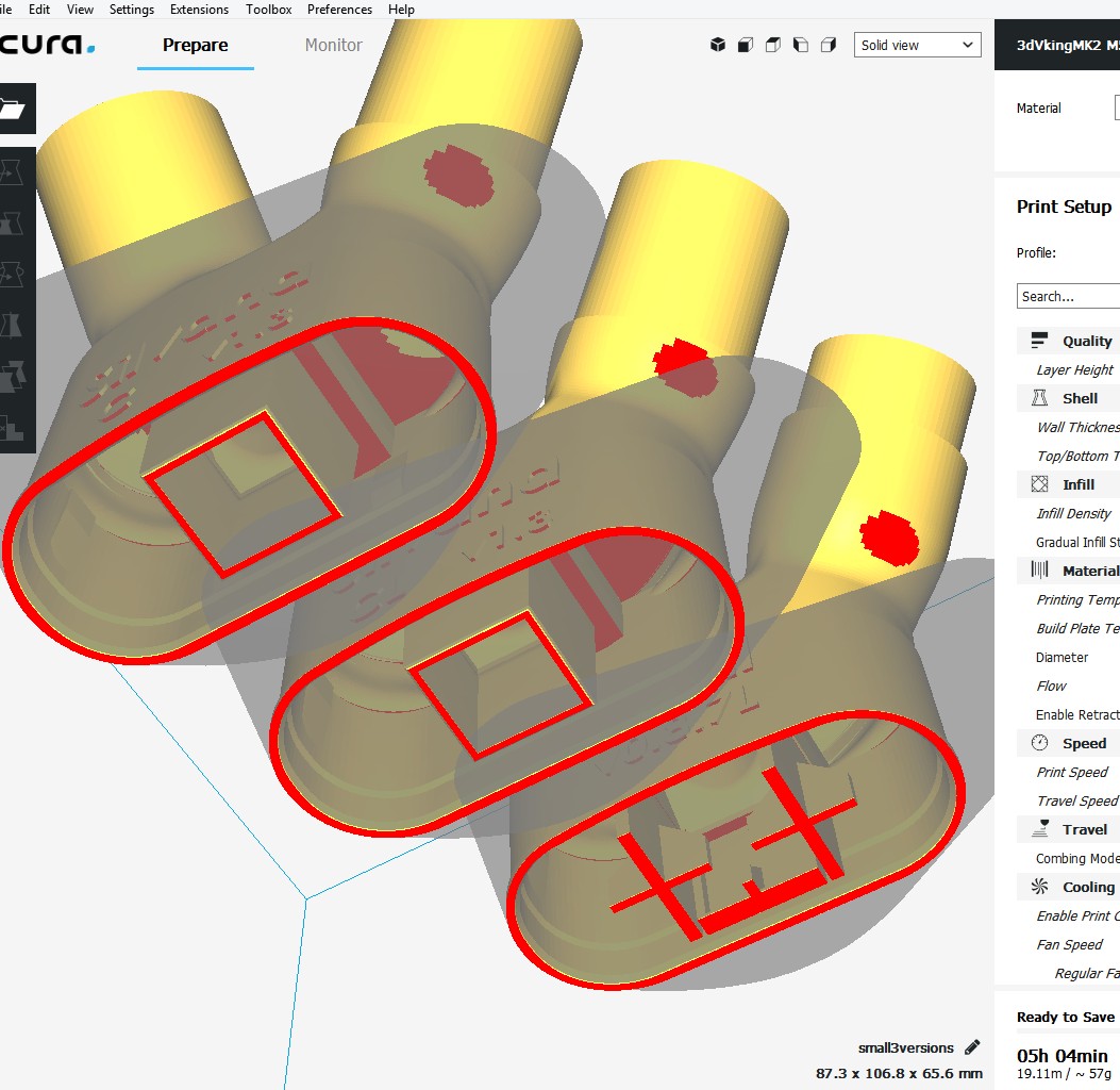Les nouvelles versions (silvana_c_v13.stl ou silvana_cl_v13.stl en version loose que je teste ici par rapport au v087) n'ont plus de support intégré. Sur le site de Prusa on conseille de surtout pas essayer d'enlever la buse du milieu. Toujours imprimer sans support.