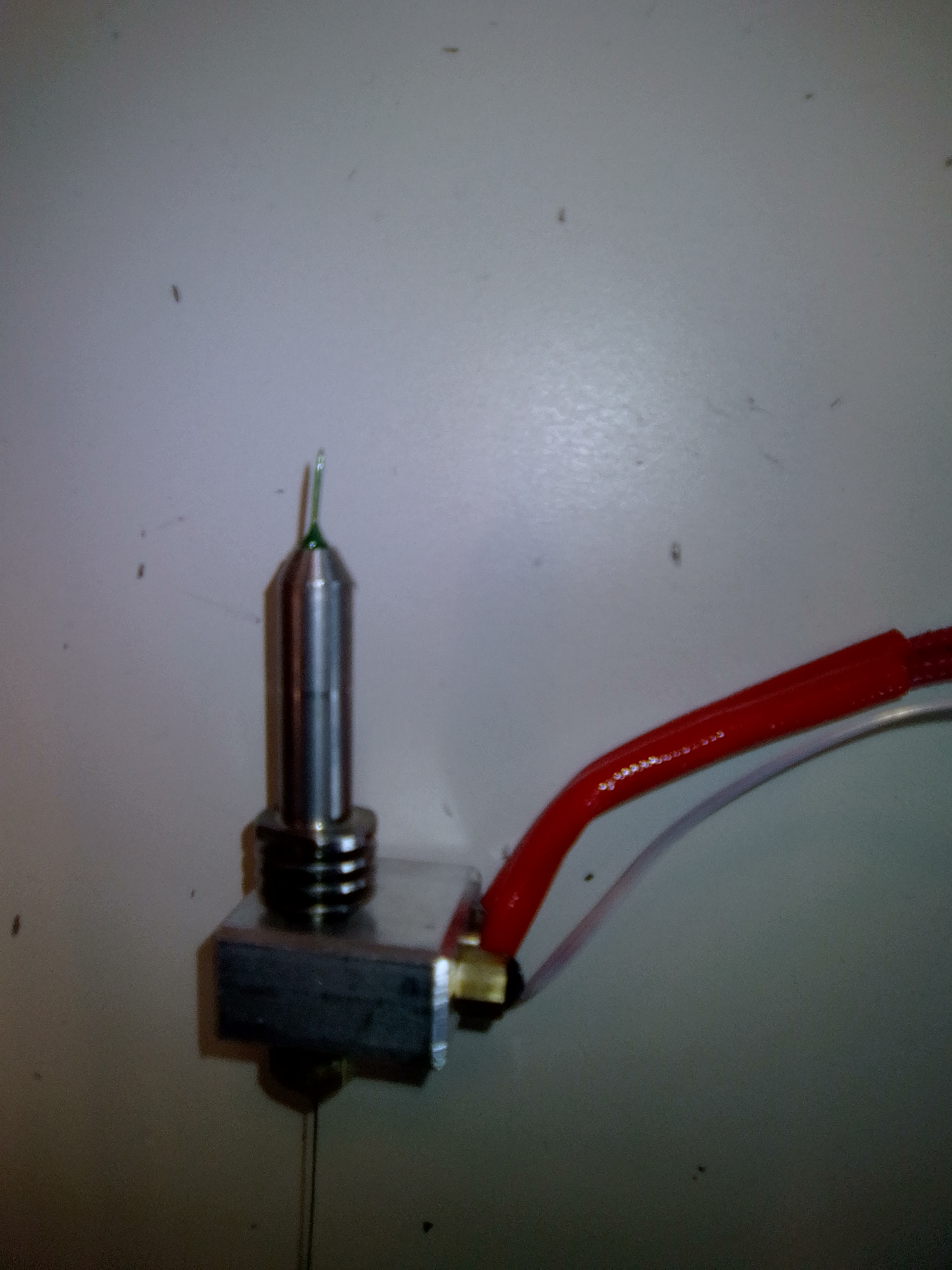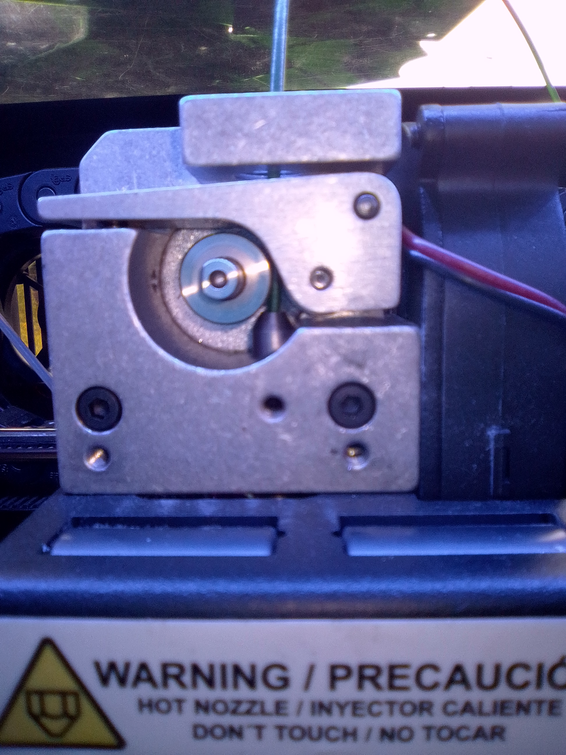 La buse montée ce matin est donc plus ancienne, mais propre et elle a un PTFE neuf. A ma grande surprise, ça ne va pas mieux du tout. Lorsque j'ai mis le fil, j'ai senti que ça frottait sur du métal et que c'était très dur à pousser. Genre pas d'extrusion manuelle de peur de trop forcer sur la tête et ses axes de guidage. Très vite (dès le 1er jet de matière non manuel), un copeau est apparu à l'entrée de la buse, coté roulement presseur. Pas sûr qu'il se voie sur l'image mais on devine bien où le fil frotte. Bref, le galet cranté glisse et le filament s'écoule clairement mal : Les fausses pistes :