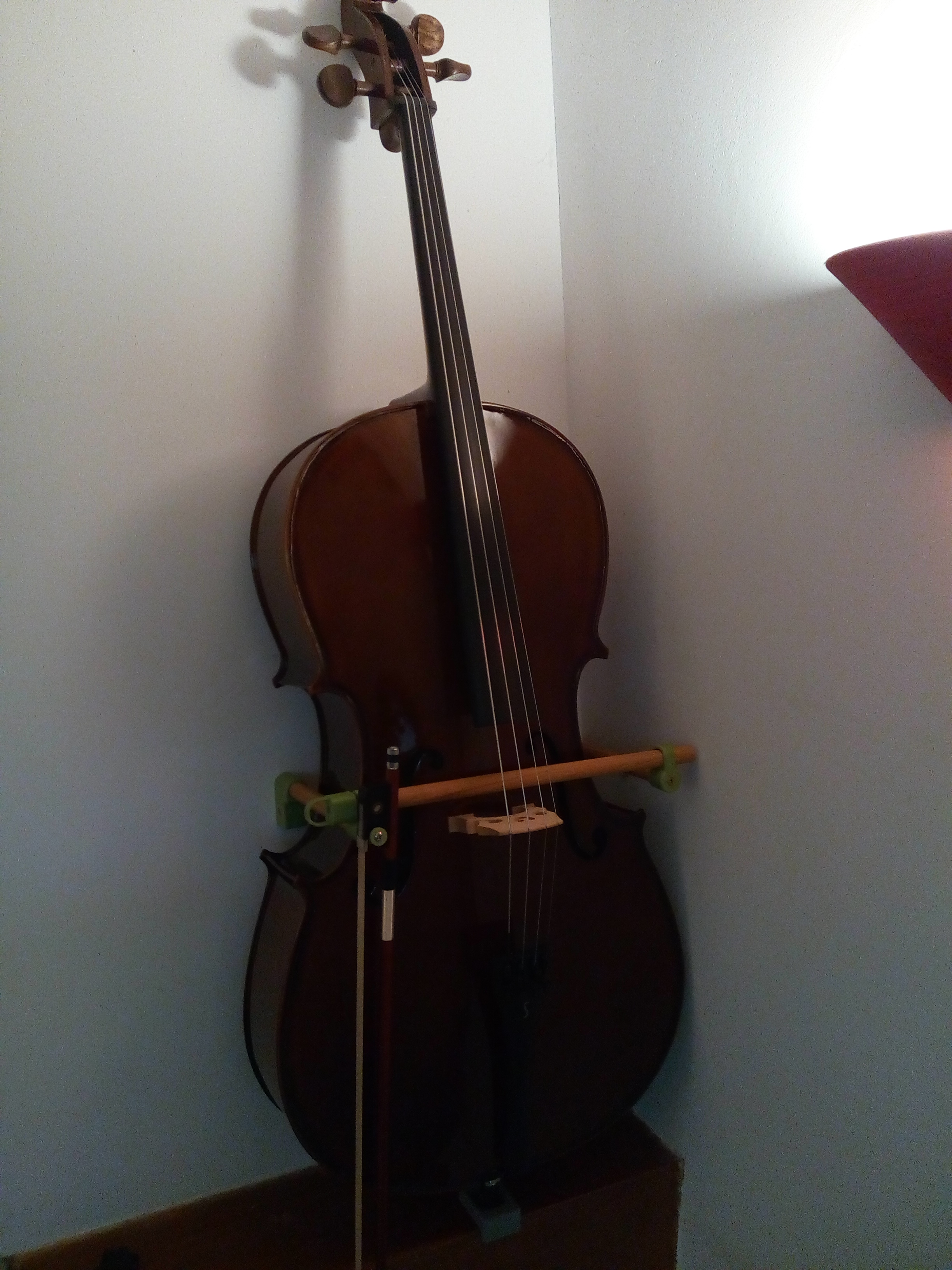 Petit chantier du week-end, le violoncelle est passé à la taille supérieure. Pour le précédent, le système "anti-chute" a été fait à la scie à chantourner, d'une pièce. En impression 3D + vieux morceaux de parc bébé, ça n'a pas été forcément plus rapide, par contre moins hasardeux (réglages possibles, pièces mal pensées refaites ou destinées à l'être après casse). Évidemment le cahier des charges impliquait de se reprendre sur les chevilles en place.