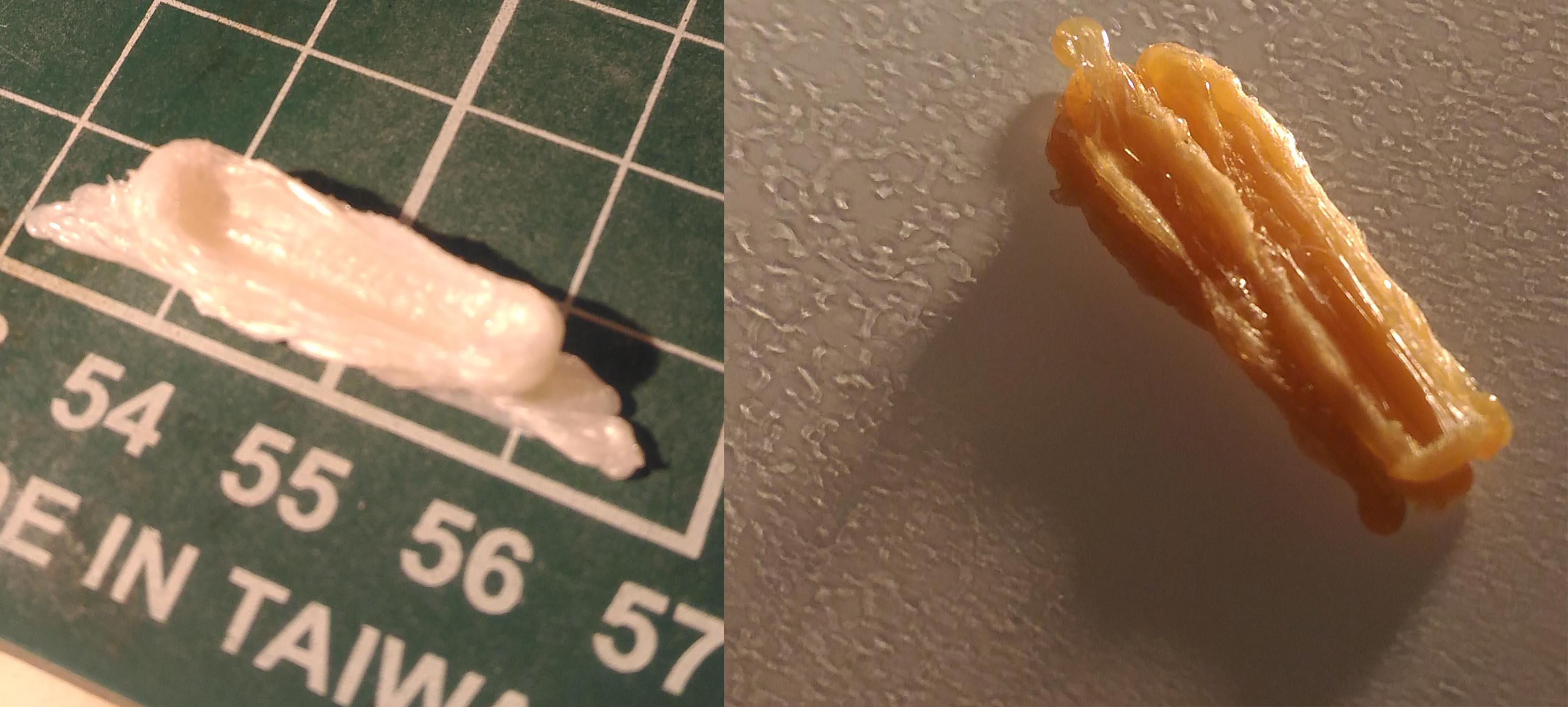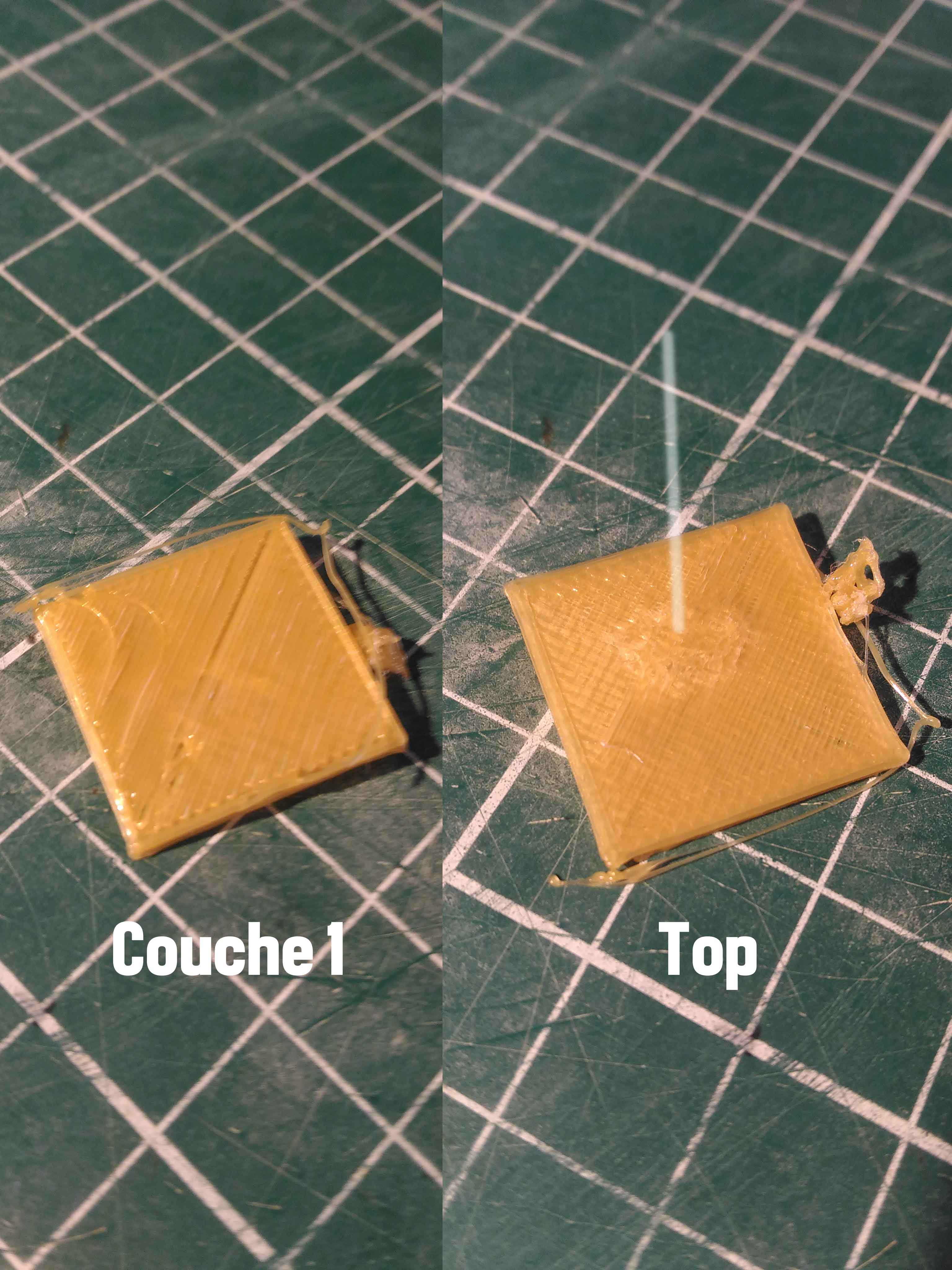 - A chaque aller/retour, pour le support la buse se stop un quart de seconde, mais le PLA continue de sortir, du coup ça fait un sortie de paté. J'ai l'impression que le PLA sort beaucoup trop vite par rapport à la vitesse d'avancée. Ci-joint mon cube posé sur une face carrée... arrêté avant car la buse imprimait dans la profondeur, et pas sur le dessus