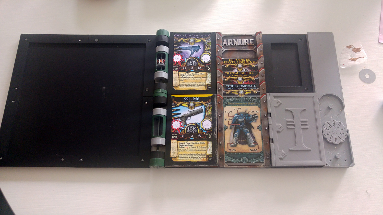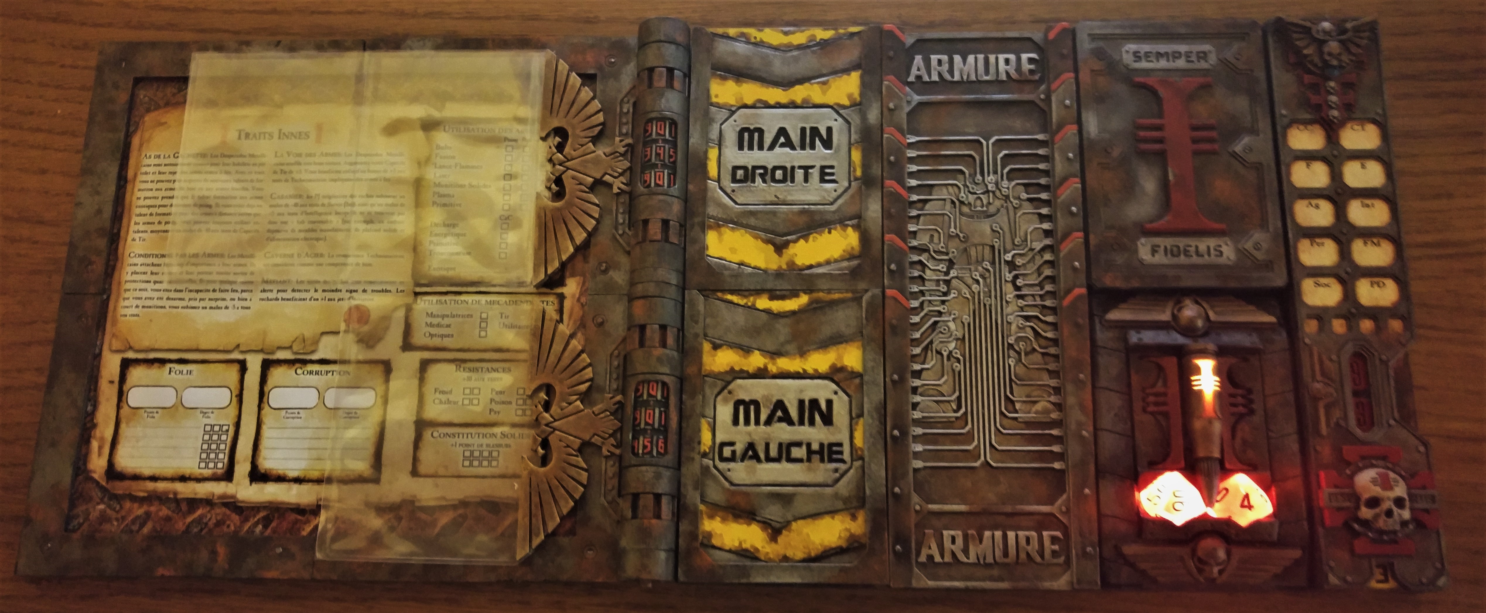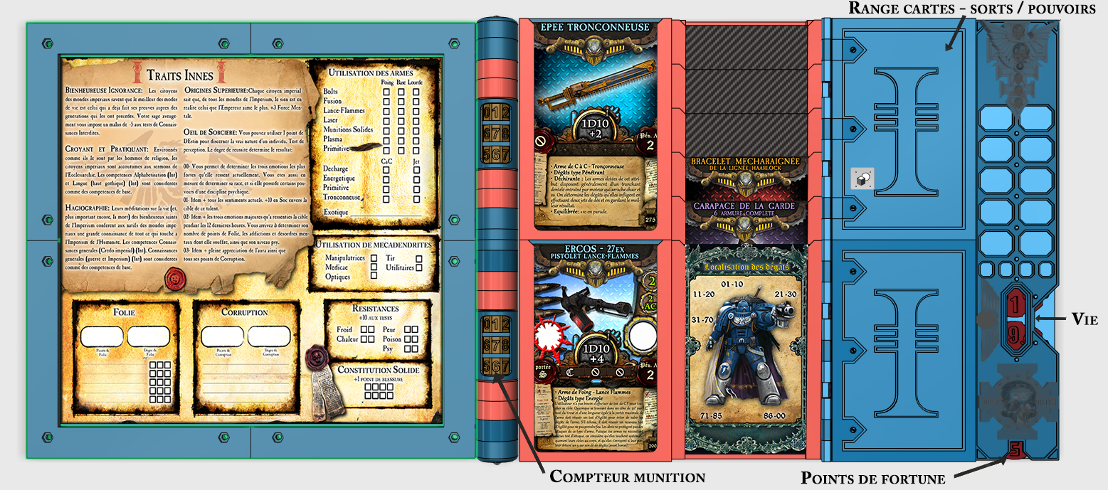 Les modules sont amovibles car ils sont fixés au moyen d'aimants. Je peux ainsi modifier les feuilles très facilement en fonction du personnage joué par le joueur.