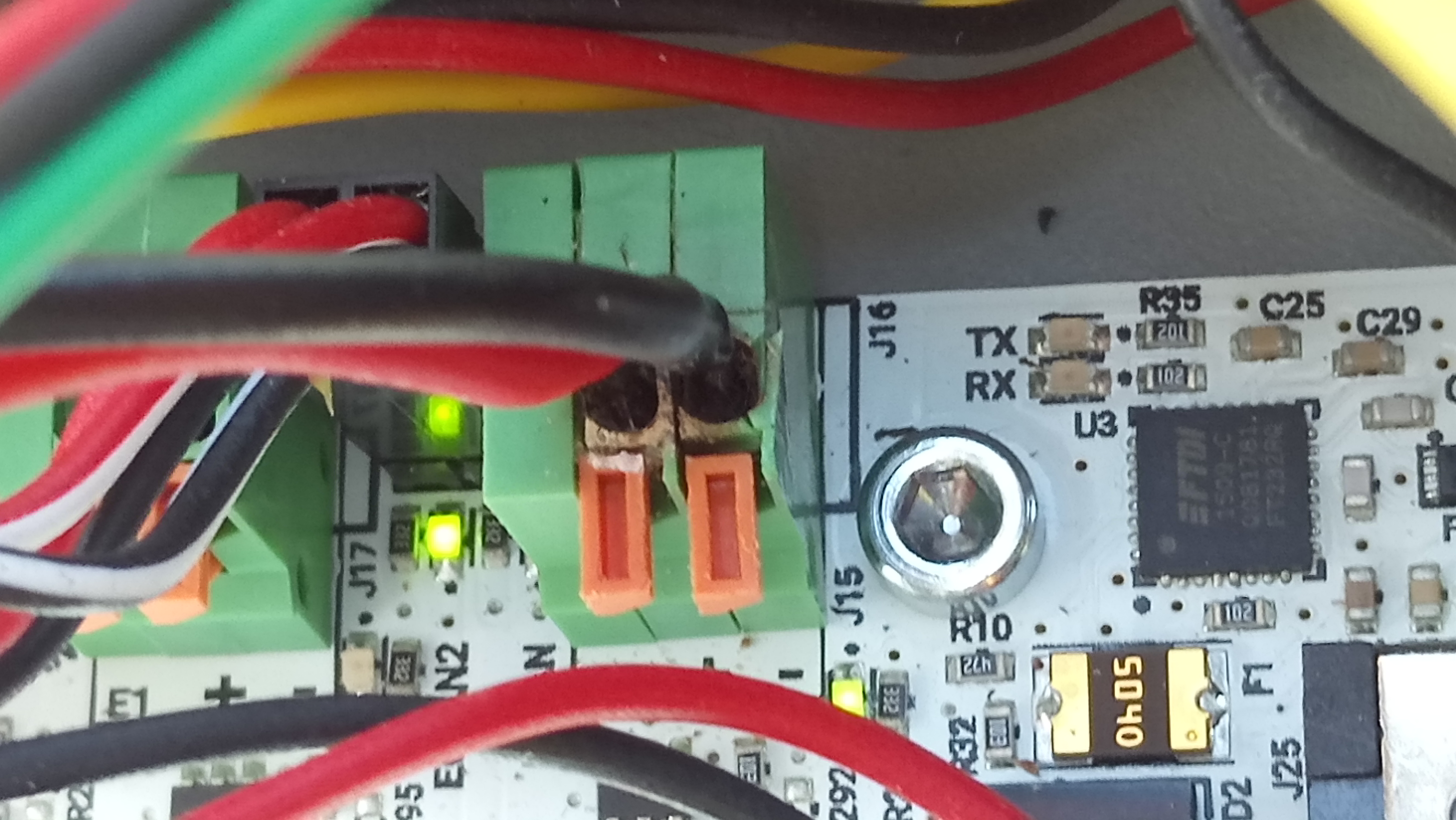 Donc pour faire simple, un gros fil (section) suppose un gros courant et donc une liaison parfaite. Dans ce cas précis nous avons plus de 3 ampères. Une bonne liaison ca suppose comme dit plus haut que les fils soient bien coincés, ce qui n'était certainement pas le cas vu l'état des borniers.