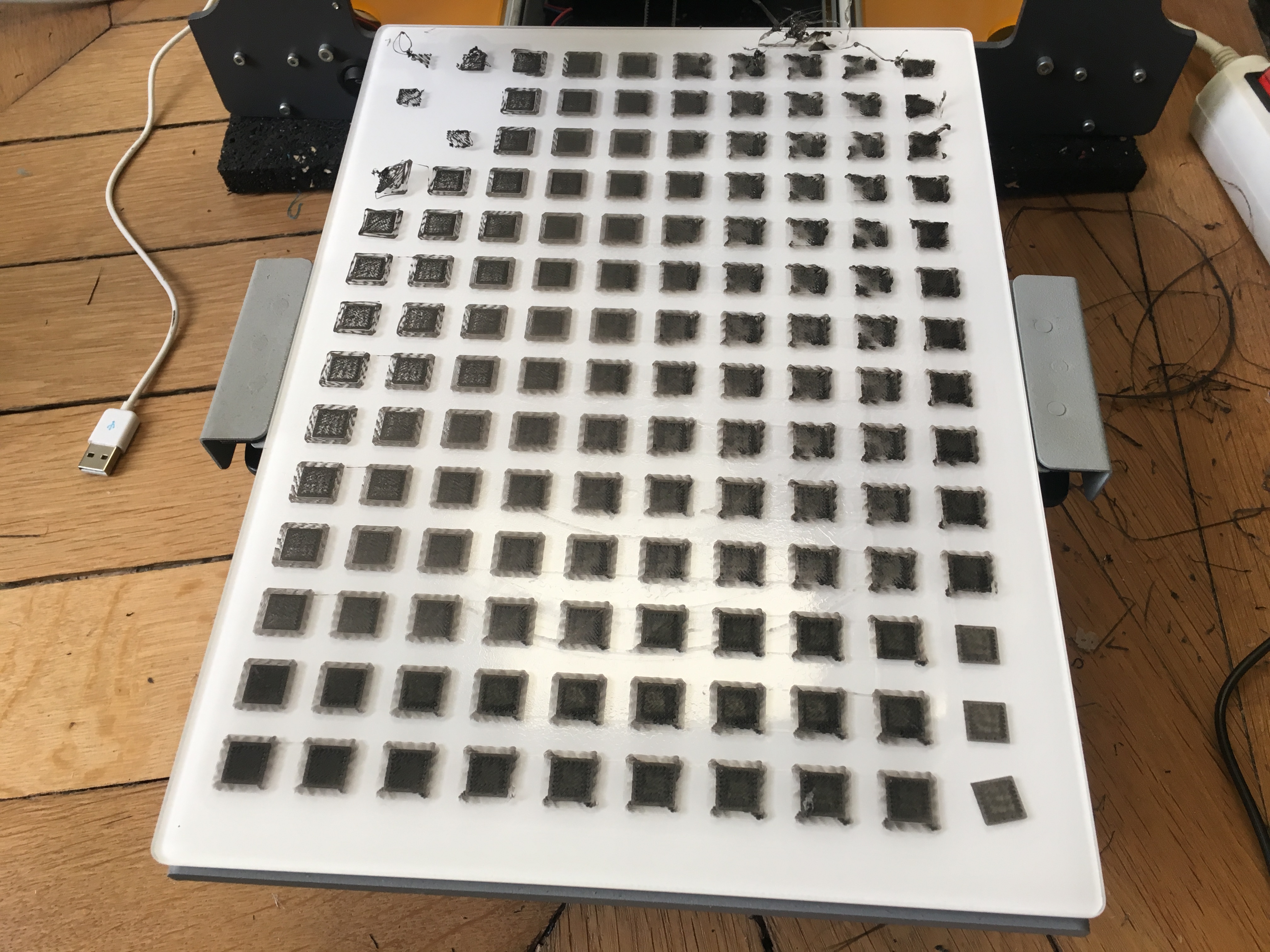 Bonjour, je commence à avoir un doute sur la planéité de mon plateau. J'ai voulu imprimer plein de petits carrés pour voir. Et j'ai bien l'impression que certains sont bien collés, et d'autres pas du tout...