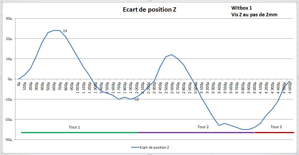 Notez aussi que le Z de la Witbox a une précision théorique de 0,62µ, inutile d'espérer y arriver si le moteur a une imprécision de 2,9µ. Autrement dit en valeur relative, un déplacement unitaire se fera avec une précision de 0,62µ, mais angulairement l’imprécision sera bien plus grande. Bon, si on imprime à 10µ par couche on risque d'avoir un résultat très médiocre avec 30% d'erreur :ohdamn: