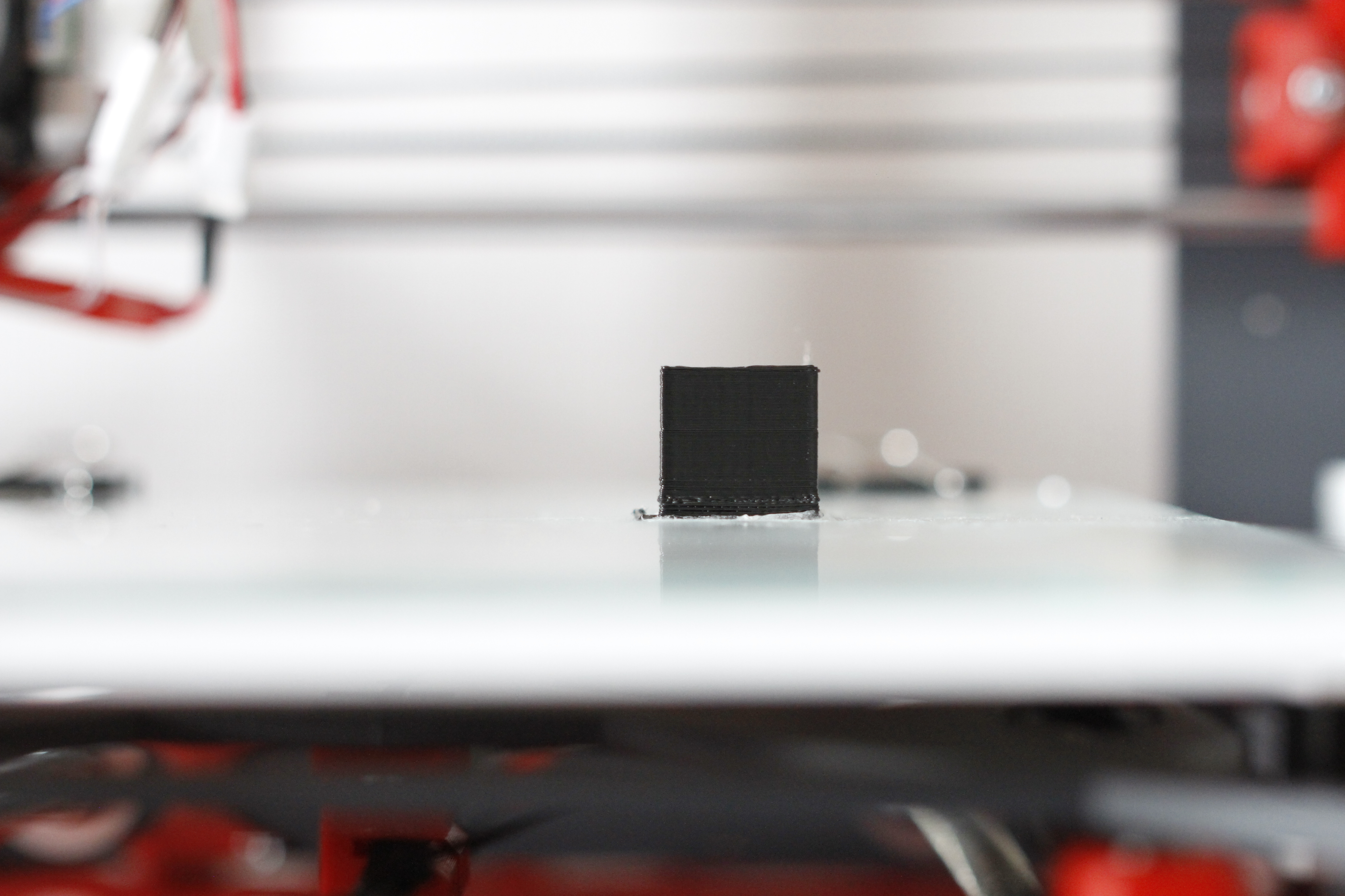 Vérifiez que votre plateau est parfaitement à plat par rapport à la buse. La première couche doit faire une bande régulière de 0,4mm et 0,2mm de haut sur tout le tracé de la buse.