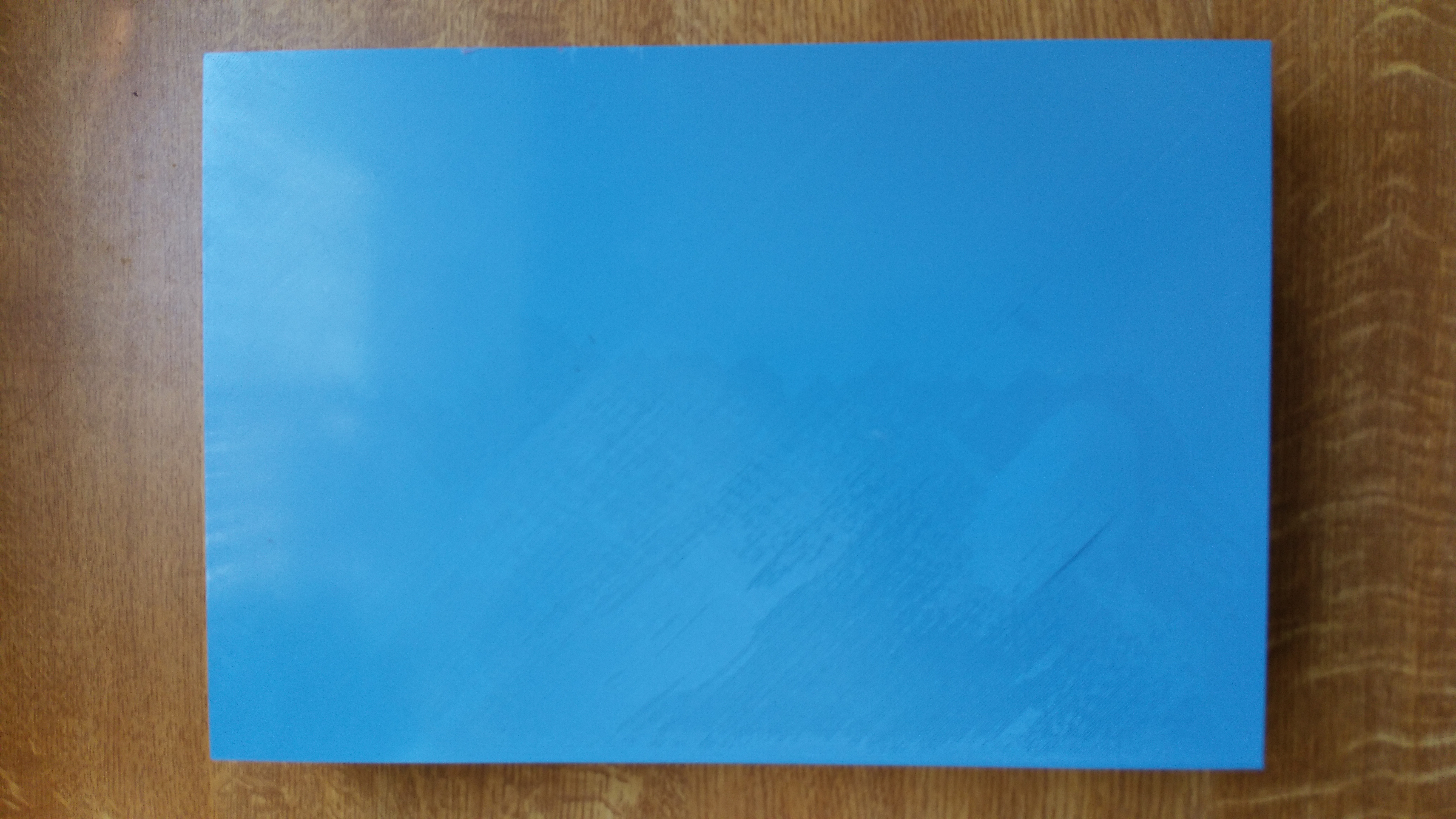 Plateau démonté, posé sur une table. Coloriage au feutre effaçable de toute la surface suivi d'un passage en X et Y avec une règle de précision : Concernant les passages en diagonale, bien qu'il soit clair que le plateau soit bombé au centre, j'ai probablement appuyé trop fort car les zones des 4 coins devraient être plus colorées. Bref, ce que j'en retire c'est qu'effectivement le plateau est bien bombé au centre, juste dans l'alignement des petites pattes pour la fixation sur le chariot Y. Cela a été vraisemblablement voulu car quand j'ai monté le plateau sur son support, le passage de la règle de précision ne montrait qu'un léger creux au centre de celui-ci. En ajustant délicatement le serrage rapide du plateau, la règle suivait parfaitement le plan du plateau.