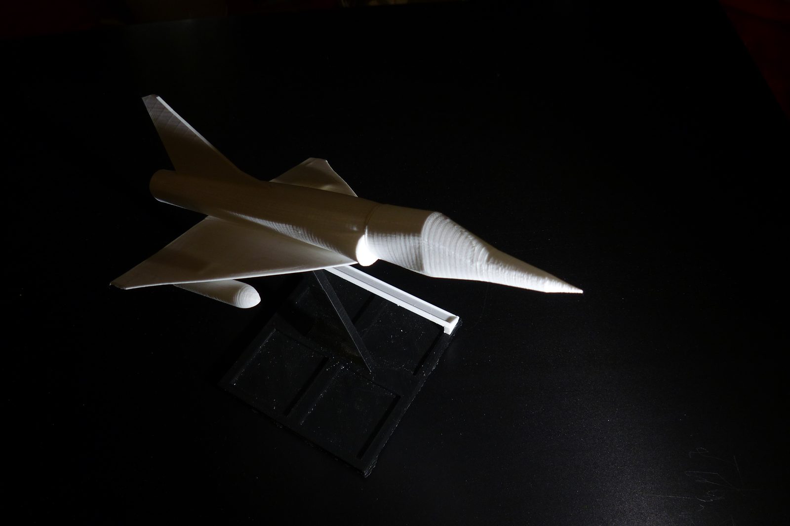 Dans le cas du Mirage j'aurais tenté l'avion posé sur son moteur (voir la construction à l'écran avant d'imprimer)