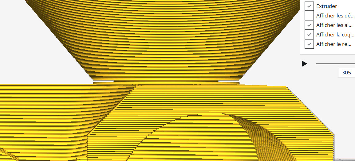 Mais du point de vue des parois horizontales, Cura fait comme si de rien n'était.. Ici, c'est le haut de la pièce verte et sur l'extérieur ça devrait être fermé (au niveau du bouton "play") :