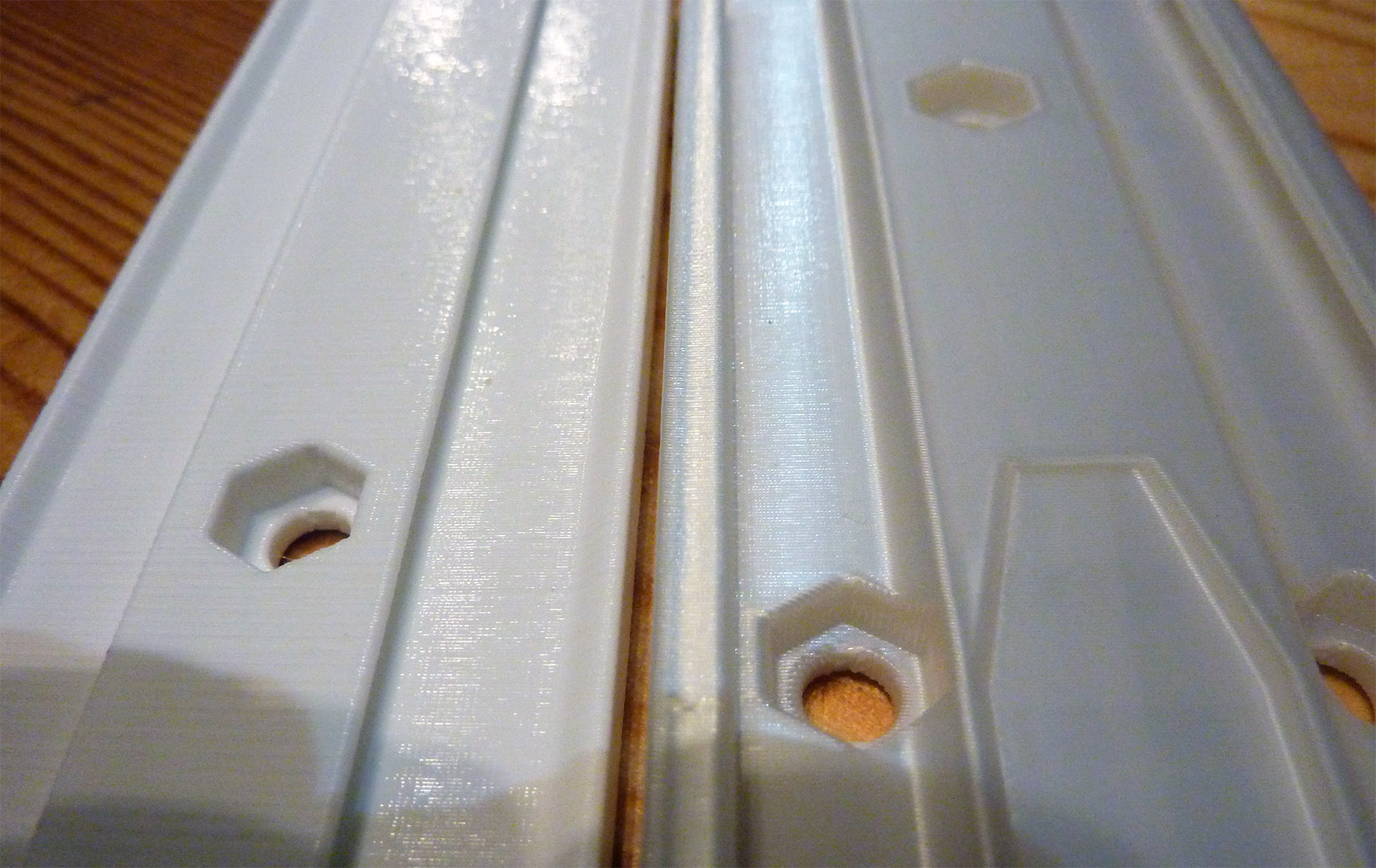 Afin d'illustrer mes propos, j'ai photographié 2 pièces techniques (des rails de fixation de ski de fond) imprimées en position verticale. Toutes les 2 sont slicer en 0.2 mm avec le même programme et le même profil et imprimée en PLA :