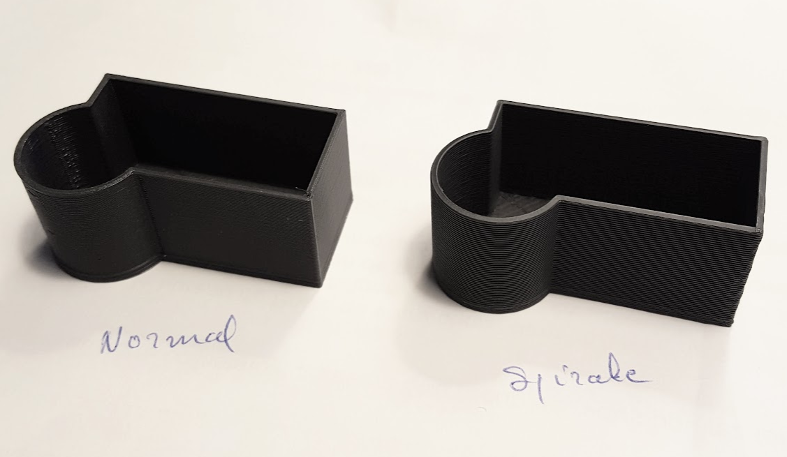 Au final, il peut être véritablement intéressant d'utiliser le mode spirale qui permet outre d'imprimer de fines parois, la possibilité de produire plus vite des volumes simples comme des casiers ou petites boites. La condition c'est de n'avoir que deux épaisseur de parois, la base et les murs. Si je prends l'exemple de petits casiers à installer dans un tiroir, on peut alors les imprimer très vite en mettant 0,4mm en dessous et 1mm en mur. Double avantage, une base fine colle bien au plateau, on peut alors réaliser vite et bien de gros casiers à disposer dans un tiroir existant.