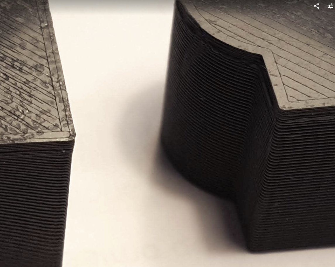 On remarque sur la pièce normale le défaut inhérent aux parois minces, le défaut de retournement qui a tendance à provoquer un manque d'adhérence sur une partie de la pièce. On a pas ce genre de défaut sur l'impression en spirale.