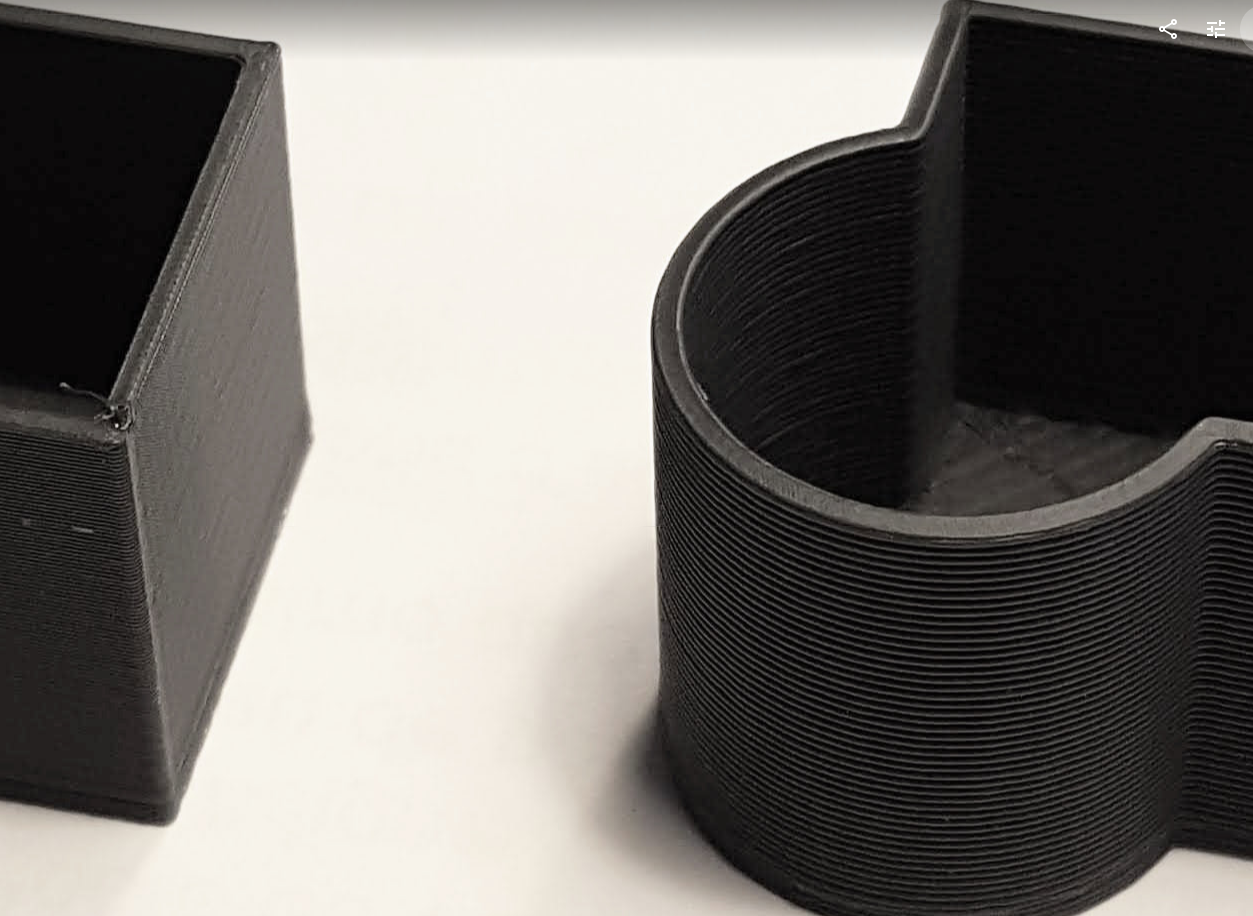 J'ai donc imprimé une boite combinant courbes et angles droits avec comme spécification des parois et une base d'1 mm dans le mode normal puis le mode spirale.
