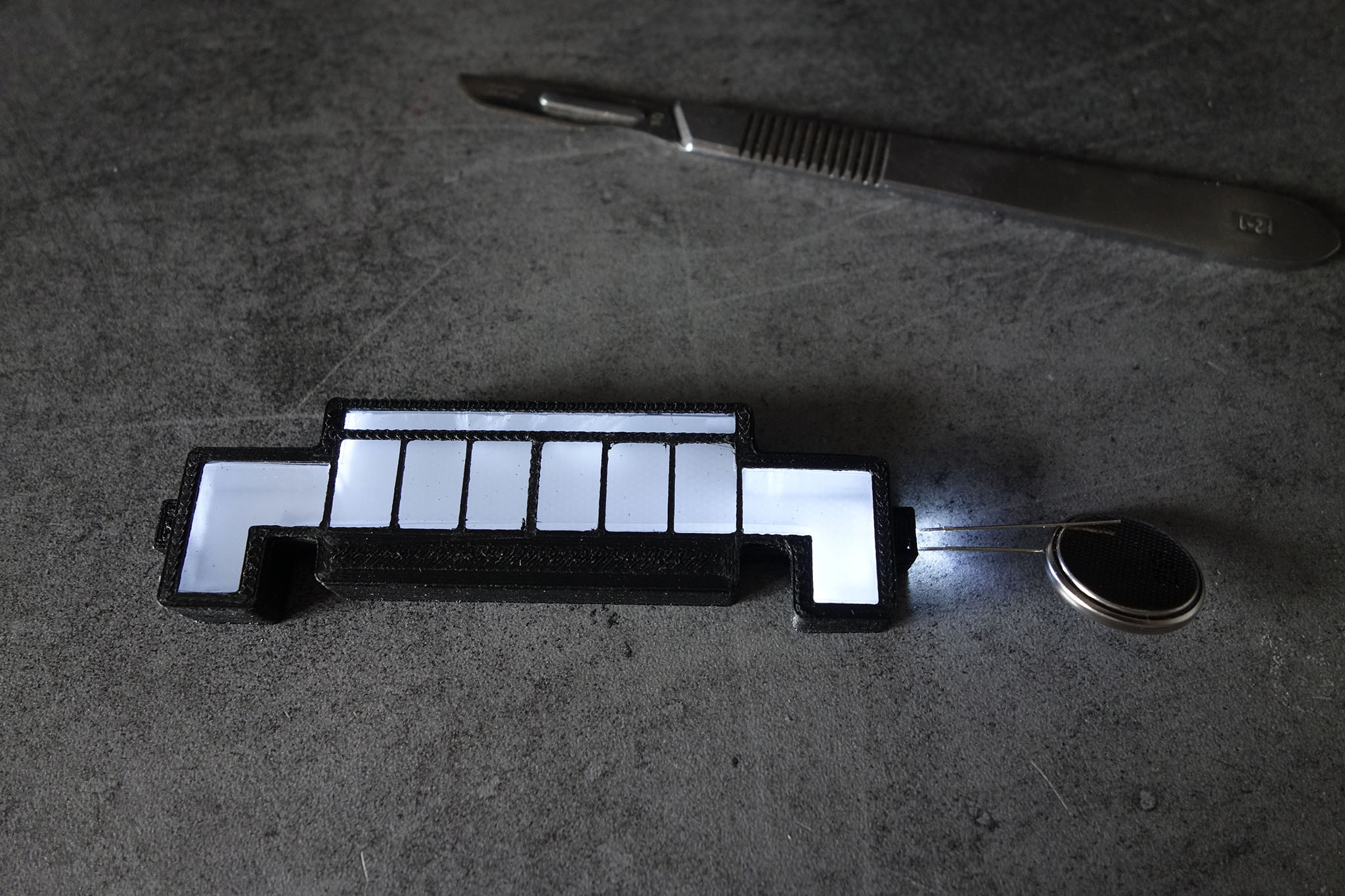 Collage de la façade à la cyano et enfin, petit test avec 1 seule LED alimentée par une pile bouton.