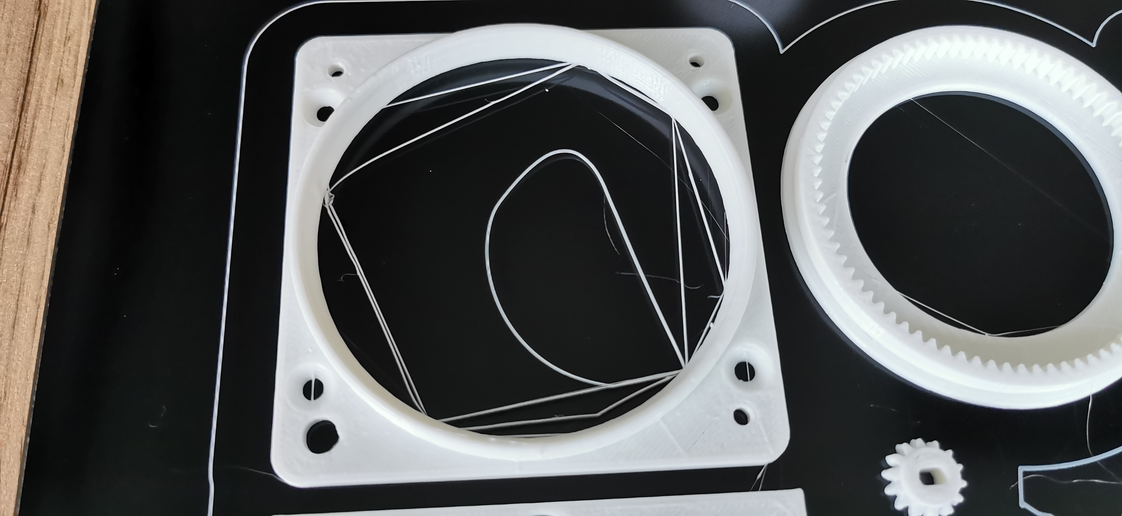 Par expérience, imprimer de nombreuses pièces simultanément n'est pas la bonne solution, surtout si l'on est pas certain que tout va s'imprimer correctement. La pièce ronde en haut à gauche a manifestement un porte à faux sous le cercle débouchant.