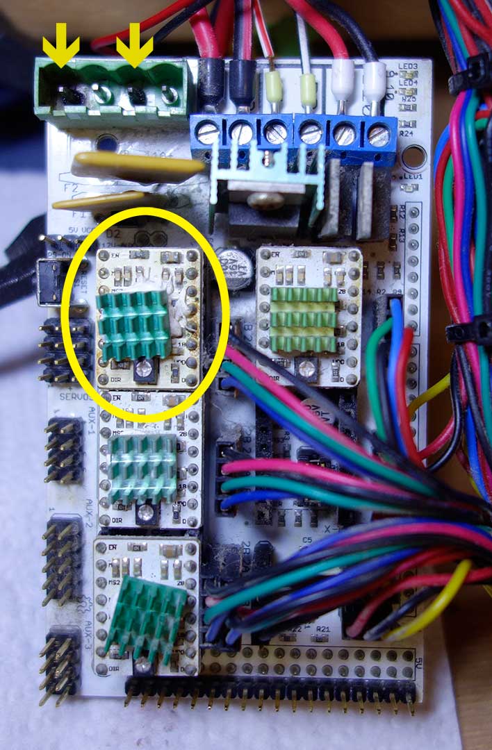 Mais il me semble également que le pcb du driver de l'axe X (que j'ai entouré en jaune) semble avoir chauffé car il est légèrement jaunis.