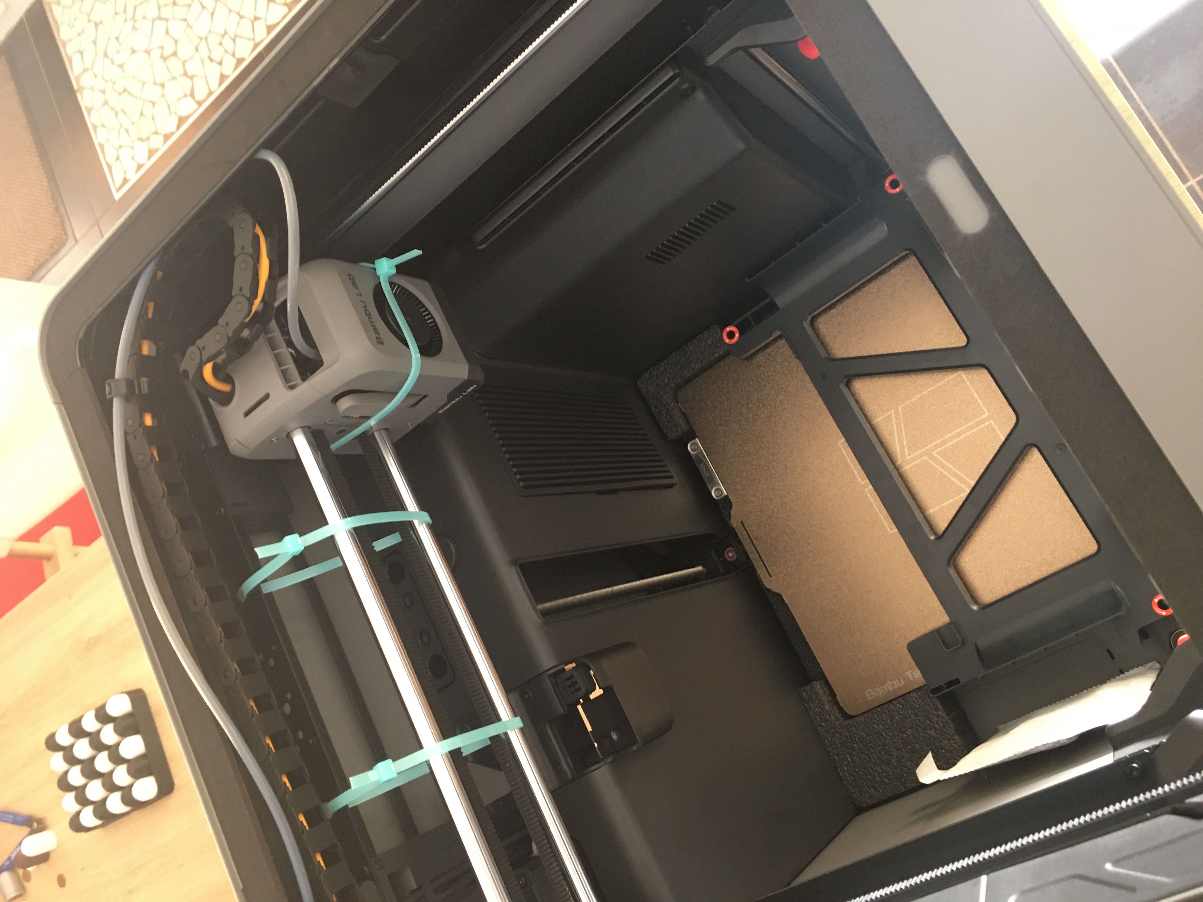 J'ai tout de même vu qu'une zone de palpage en métal existe à l'arrière du plateau. En effet, les ingénieurs BambuLad ont eu (enfin) l'idée de pouvoir déplacer la tête hors de la zone d'impression pour la prise du 0, la purge et le nettoyage de la buse.