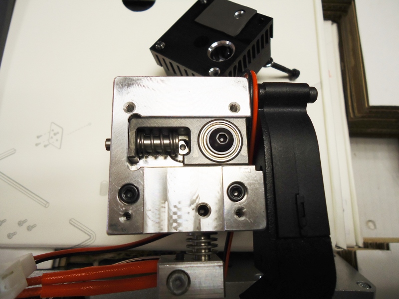 L'extrudeur mérite lui aussi un détour. L'entrainement des deux galets d'extrusion se fait par des engrenages. Un tendeur réglable permet de pincer plus ou moins le fil dans un tube usiné. Impossible de s'échapper à coté, le guidage est parfait, le Filaflex se chargera aussi simplement que le PLA. Par contre le débrayage se faisant par le tendeur à l'aide d'une vis, le chargement/déchargement se fera exclusivement par l'électronique.