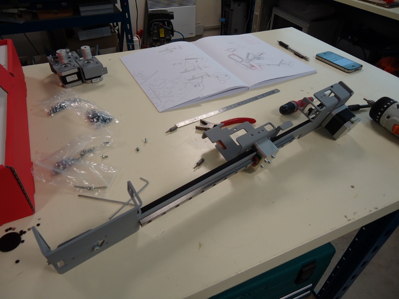 L'axe X monté. Vous noterez la présence d'un réglet, en fait il ne sert à rien, les vis sont dessinés à l'échelle 1 et lorsqu'il y a une cote à prendre un réglet est dessiné sur la page.