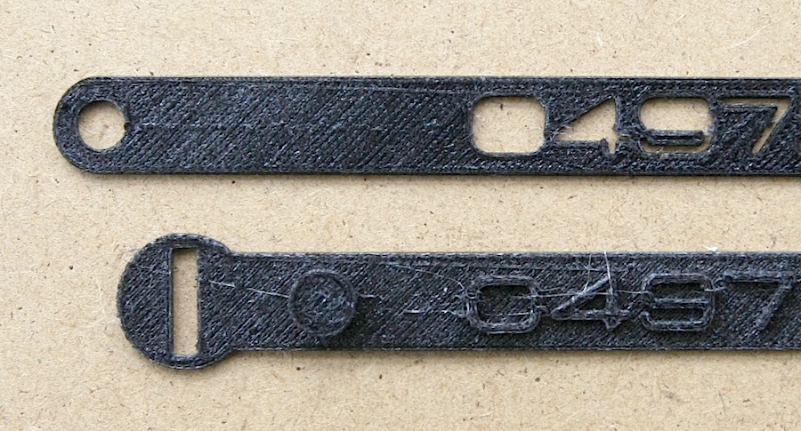 Essai 1 : J'ai d'abord imprimé un bracelet avec du texte perforant totalement le support (voir fil de discussion sur " typo spéciale 3D " dans " conception ") : c'est très visible si l'on pose le bracelet imprimé en noir sur un support clair. Cependant, au final, c'est trop fragile à certains endroits. Idée abandonnée.
