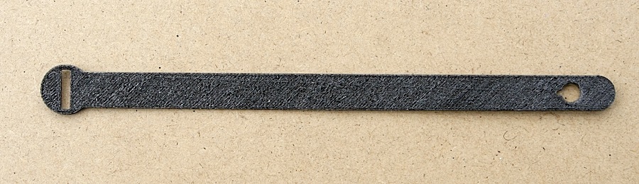 Essai 2 : bracelet avec texte en relief imprimé dans une seule couleur : ce n'est pas très lisible. Le bracelet doit rester étroit (ici 12mm de large) et le texte aussi précis que possible. Le lettrage fait ici 7mm : après essais divers, c'est le minimum pour pouvoir le lire facilement.