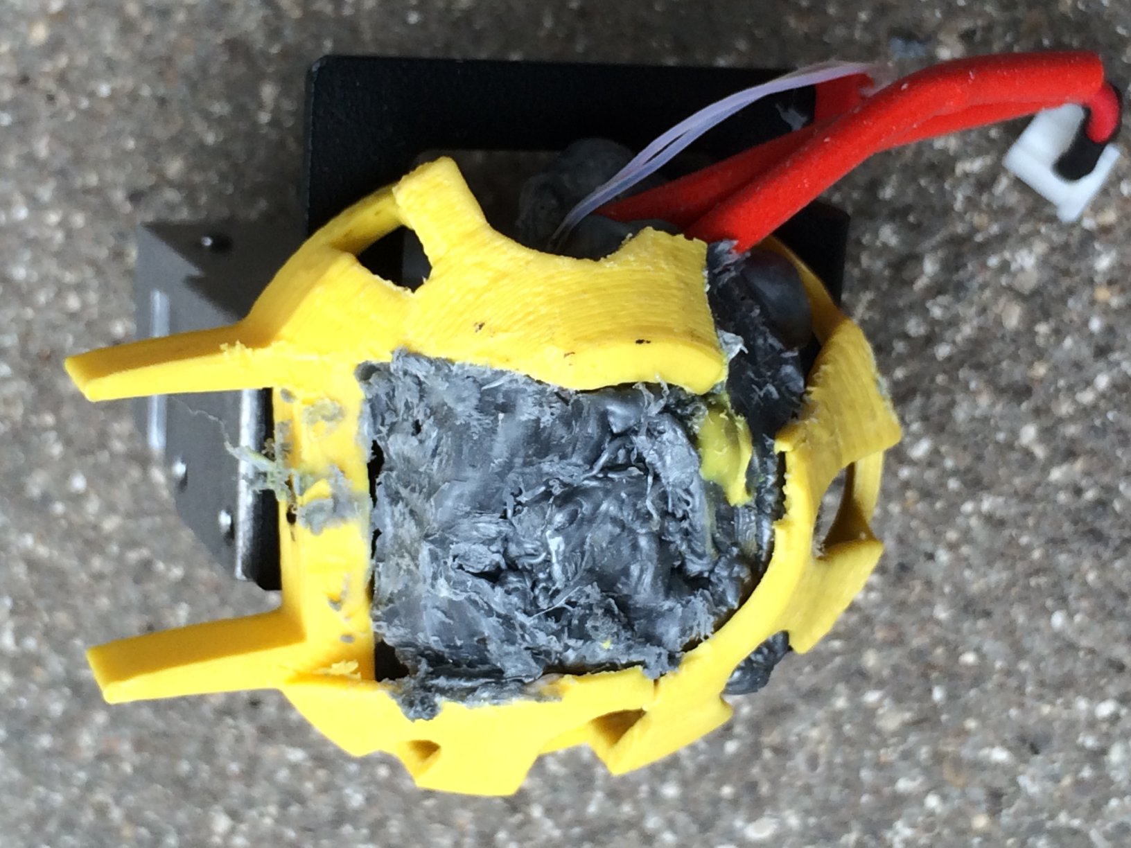 Mésaventure : la dimension de la pièce plate (8 cm de diamètre) que j'imprimais a fait que un bord s'est décollé, mais pas tout, ce qui a bloqué la tête en position fixe et à rempli son environnement (PLA).