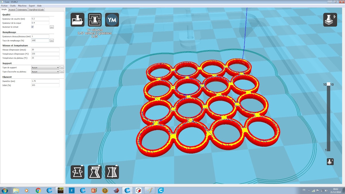 Pour ce genre d'objets très aérés, votre analyse met aussi en évidence l'impact de l'épaisseur de la paroi de l'objet et des paramètres d'impression (diamètre de la buse, épaisseur de la coque, infill) sur le trajet que calcule Cura pour déplacer la buse.