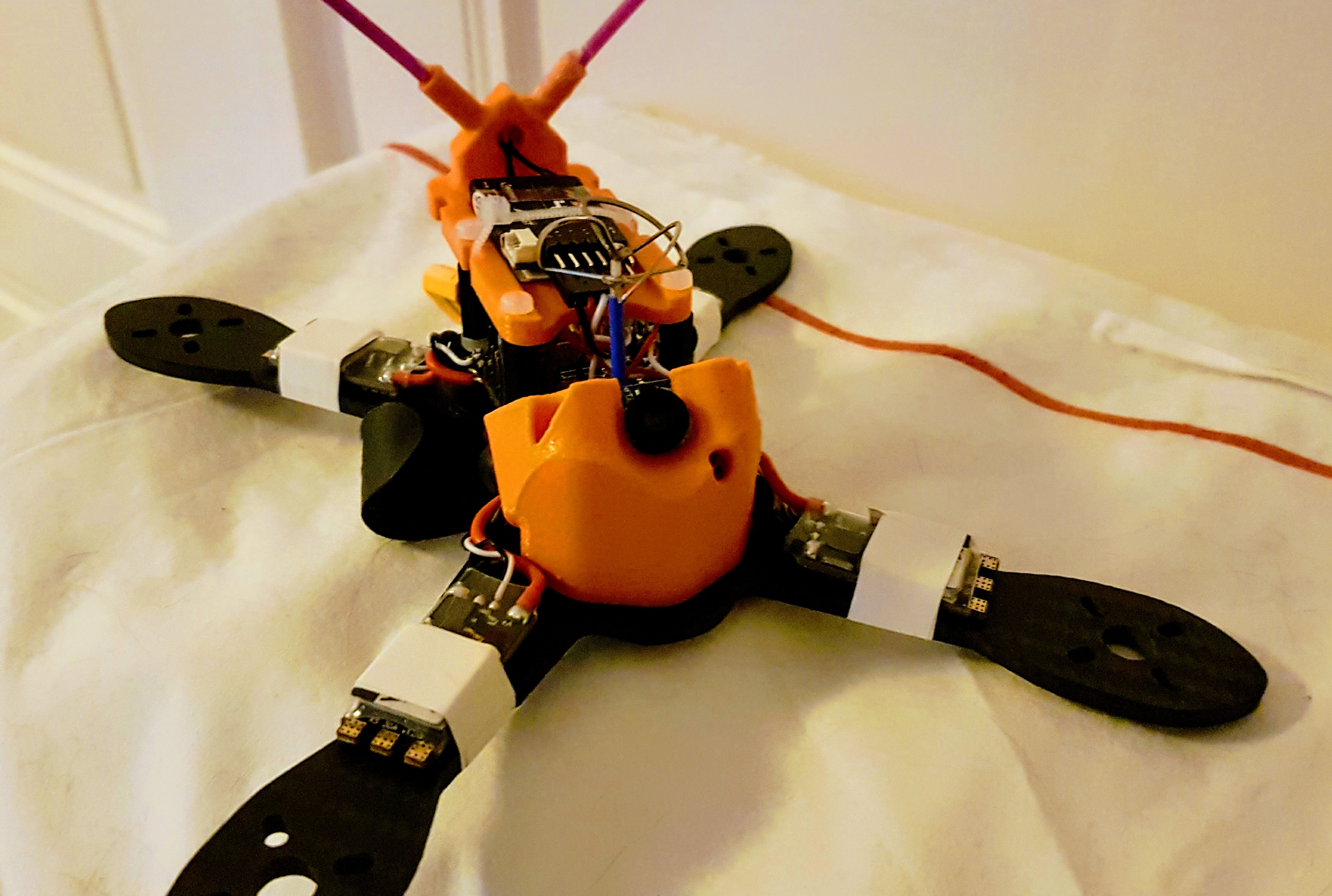 Dans un soucis de poids, je me suis creusé un peu le crâne pour loger ma Aomway (cam+transmission 5.8 incluse) dans un boitier protecteur. Il reste encore la partie antenne à protéger.