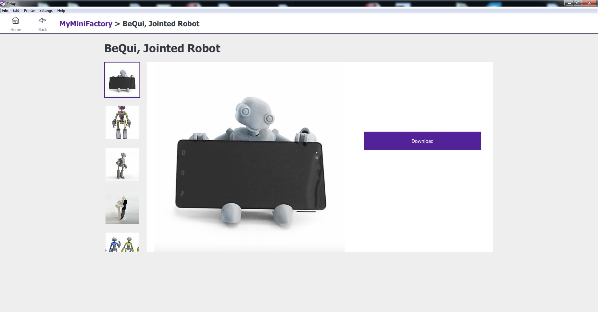 Le menu avec un accès rapide sur la plateforme Myminifactory directement sur Zetup Et voici à quoi ressemble le slicer, pour le moment, n'ayant pas encore l'imprimante, je peux seulement jouer avec le STL,