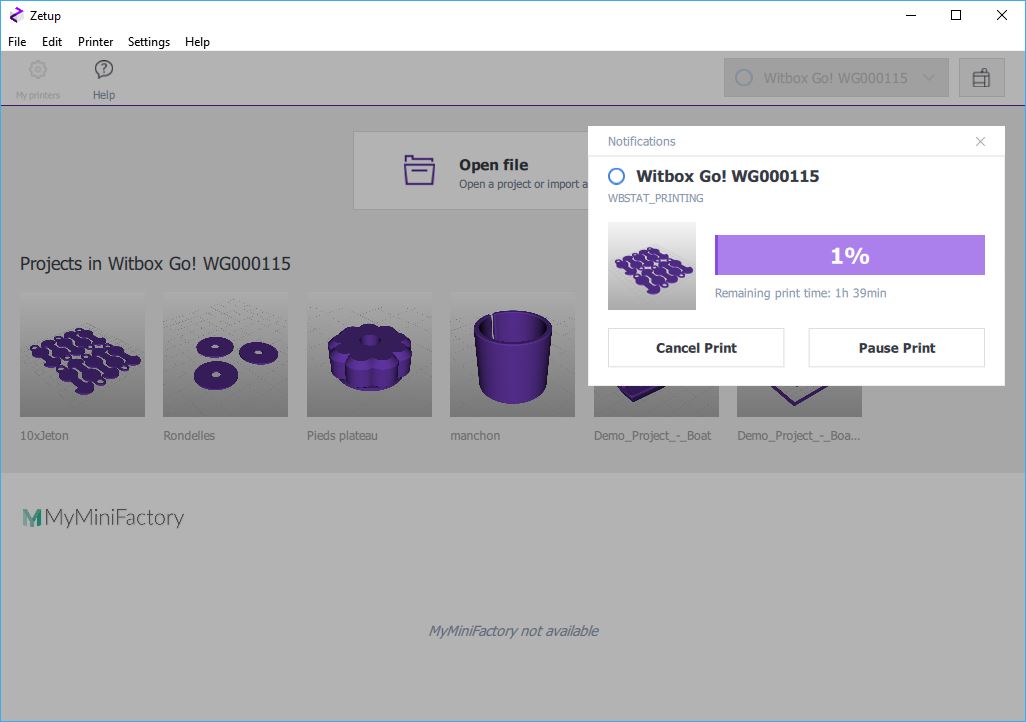 Zetup étant un logiciel client de l'imprimante, il peut être ouverte sur votre PC, votre tablette ou votre téléphone, vous y trouverez les mêmes informations. Après le lancement d'une impression, vous pouvez fermer l'appli, l'imprimante continuera son travail. Pour le moment il n'y a que l'appli Windows et Android qui fonctionne. dans 2 mois la version IOS sera dispo.