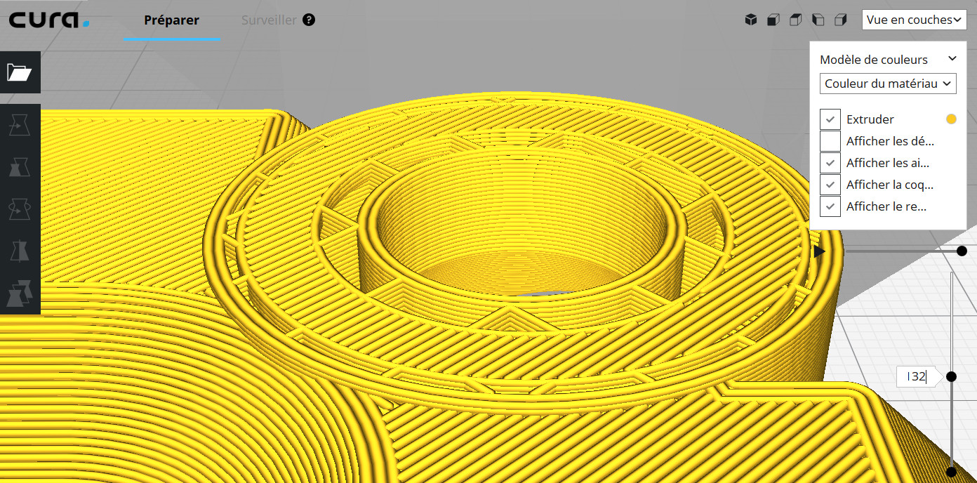 Peut-être que quelqu'un ici pourra - une nouvelle fois - m'aider... Je voudrais imprimer ces 2 pièces ensembles, l'écrou jaune étant prisonnier de la pièce verte : J'ai exporté un seul stl en vérifiant qu'il y avait bien 1 couche non imprimée entre mes pièces : Mais du point de vue des parois horizontales, Cura fait comme si de rien n'était.. Ici, c'est le haut de la pièce verte et sur l'extérieur ça devrait être fermé (au niveau du bouton "play") : 2 couches plus haut, c'est la 1ère couche de l'écrou jaune (toujours au niveau du symbole "Play"), et elle n'est pas fermée non plus. Si j'ajoute une 2e couche de décalage en z entre les pièces, c'est pareil. Si je place l'écrou dans sa position d'utilisation, 5 mm plus haut, là les couche horizontales sont bien fermées partout, mais ça oblige à mettre des supports... Je n'ai pas prévu de ne pas dormir pour ça, mais si quelqu'un sait ce que je fais mal, je suis curieux...