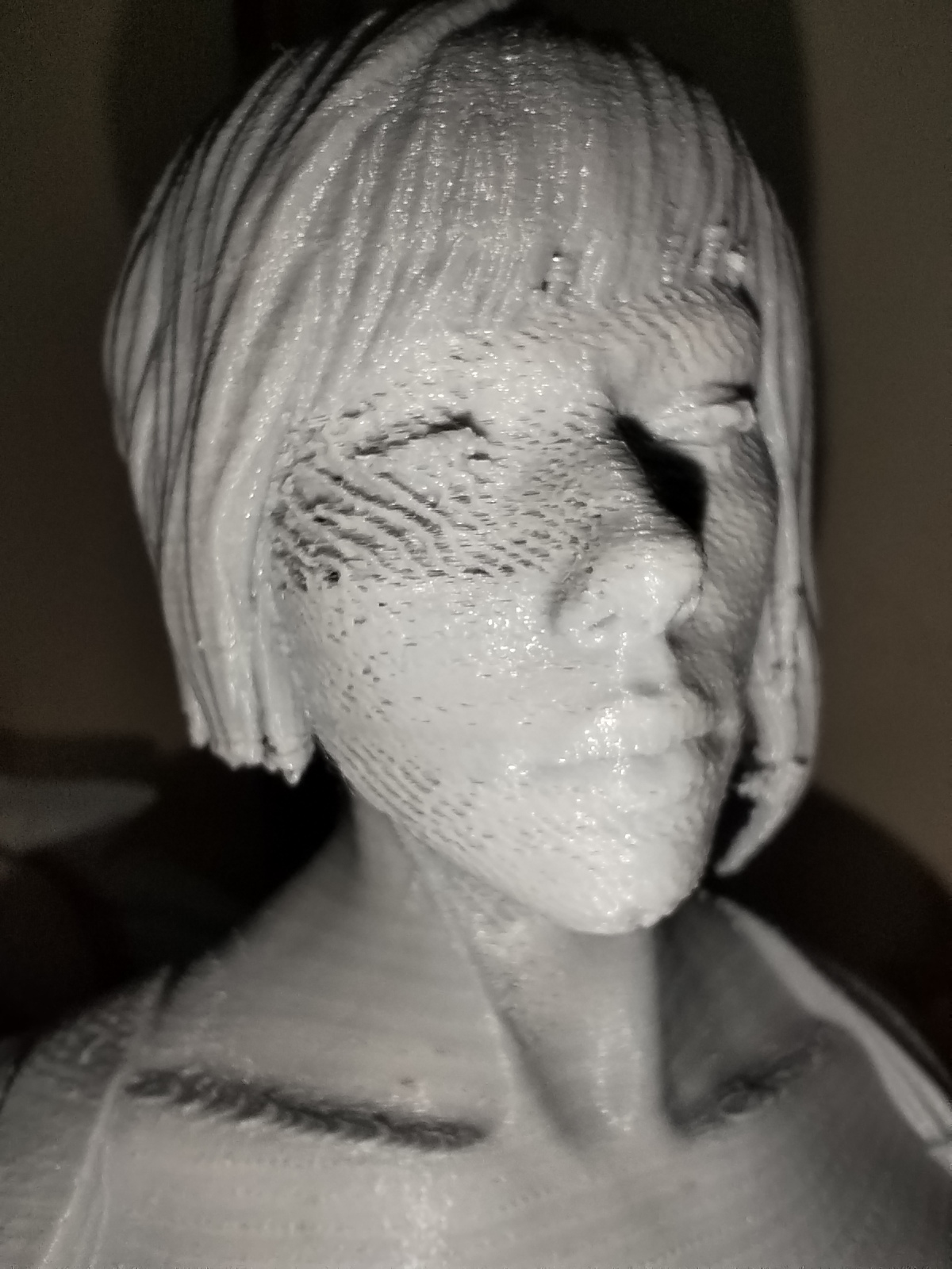 Clairement le visage manque de matière. Cela est provient d'un manque d'avance du fil lors de l'extrusion.